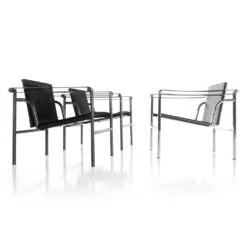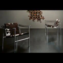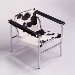 Cassina’s ‘1 Fauteuil a Dossier Basculant’ designed by Le Corbusier, Charlotte Perriand and Pierre Jeanneret – previously known as the LC1 chair – can be ordered with a trivalent chrome plated or semi-matt black enameled steel frame. The seat and back slings can be finished in saddle hide with matching leather arm straps. Plain black or black/brown/white Hairyskin seat and back slings are always finished with black leather arm straps. Due to the randomness of natural skin pigmentation, the pattern of Hairyskin markings cannot be specified.