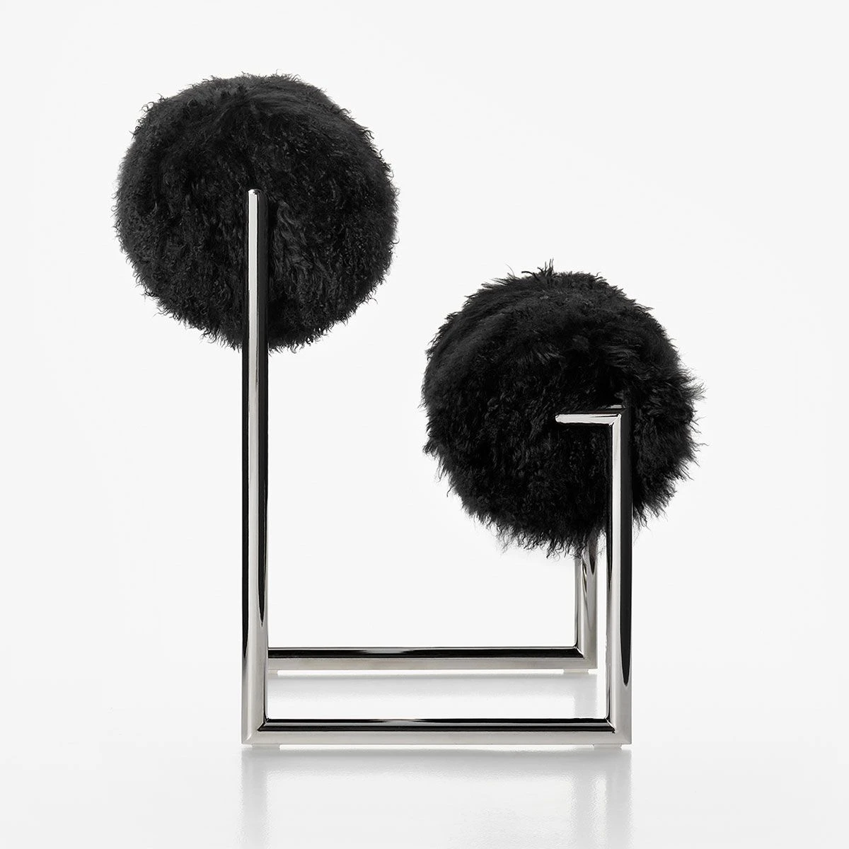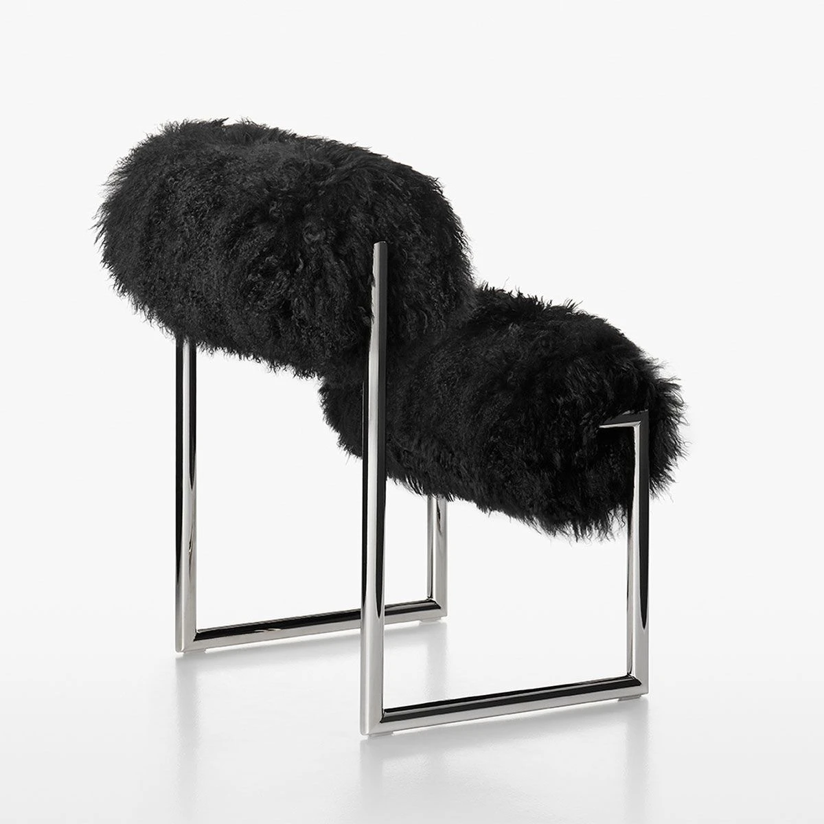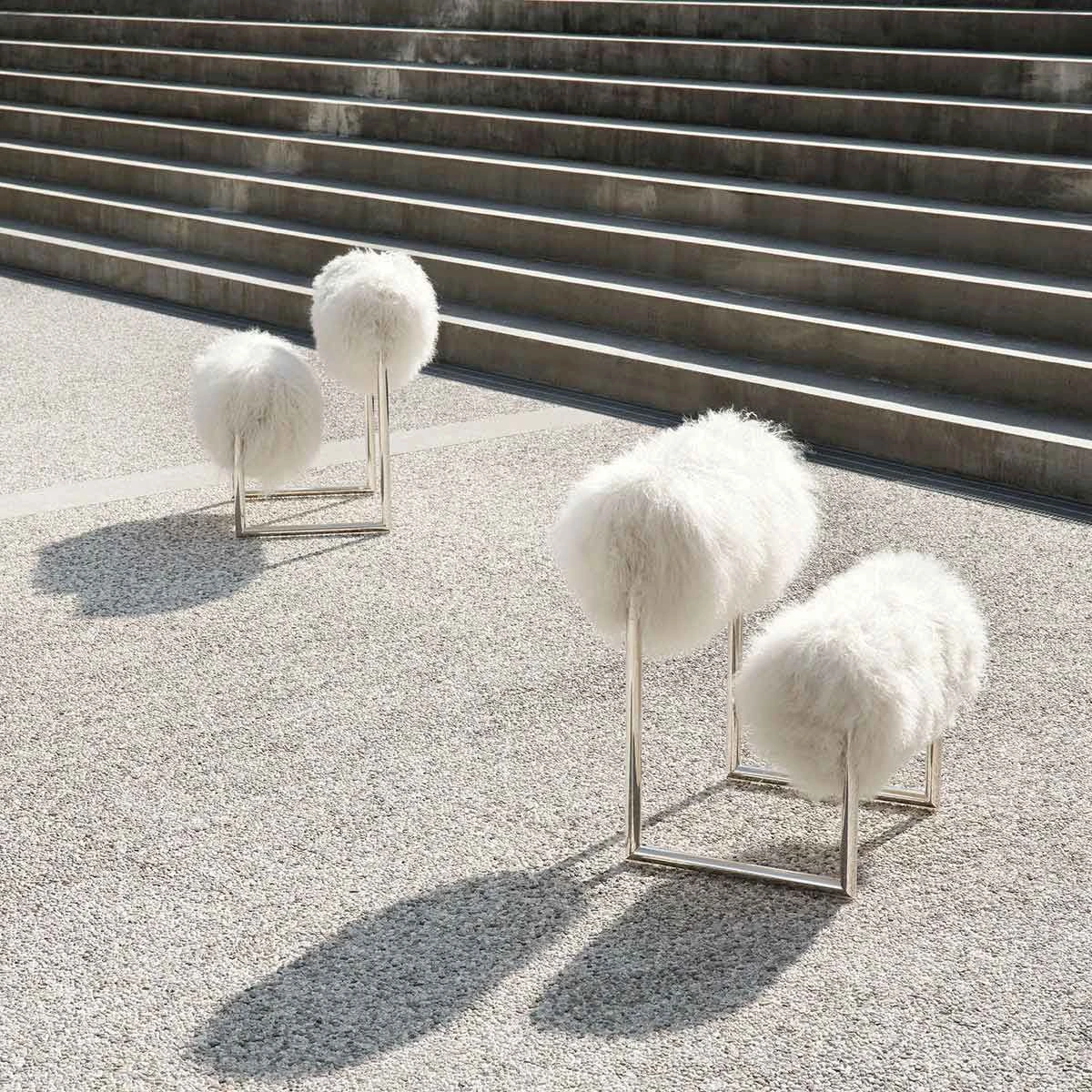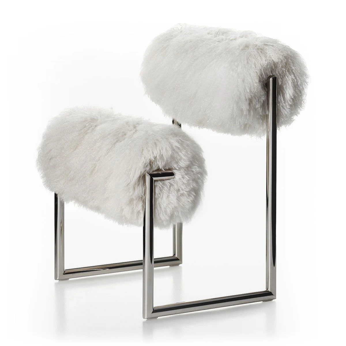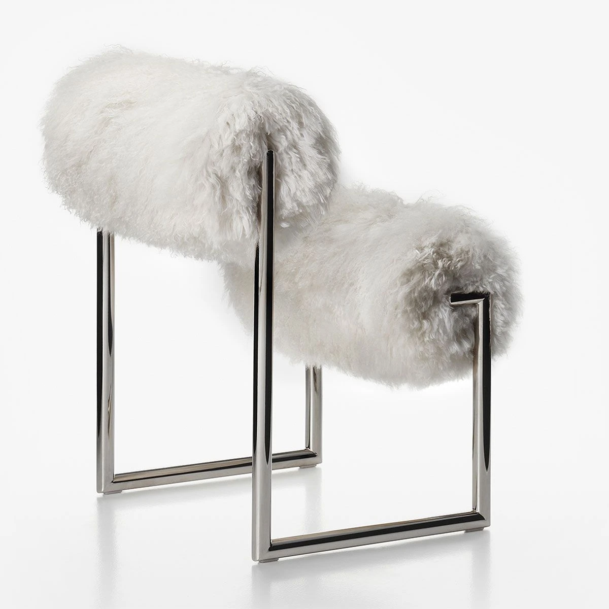 The seat and back are padded with single-density polyurethane foam in a Ø 19 cm cylindrical shape upholstered in Mongolian goat fur in white, black and rust.