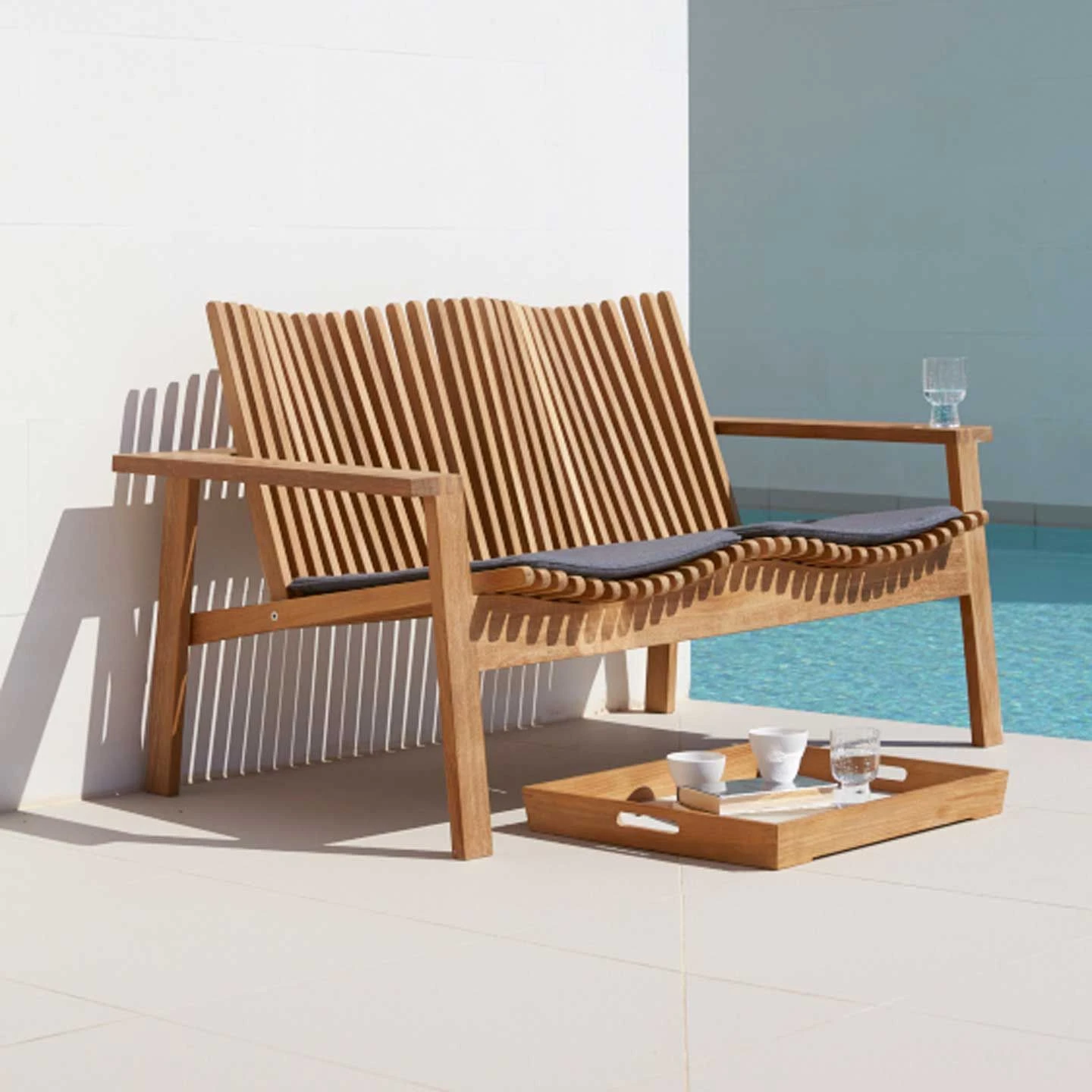This beautiful 2 seater lounge teak sofa is a design statement of simplicity, comfort and craftsmanship, which can be ordered with or without seat cushions. The Amaze teak sofa is manufactured in untreated, certified teak wood, which allows one to choose how to preserve the teak. Either the teak may be left untreated, in which case it will develop a beautiful grey patina over time and will only require a minimum of cleaning. Or the untreated teak can be oiled with a suitable teak oil. Depending on the climate in which it is to be used, oiling may be required a couple of times a year. Amaze is designed by danish designers Foersom & Hiort-Lorenzen