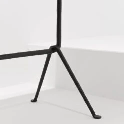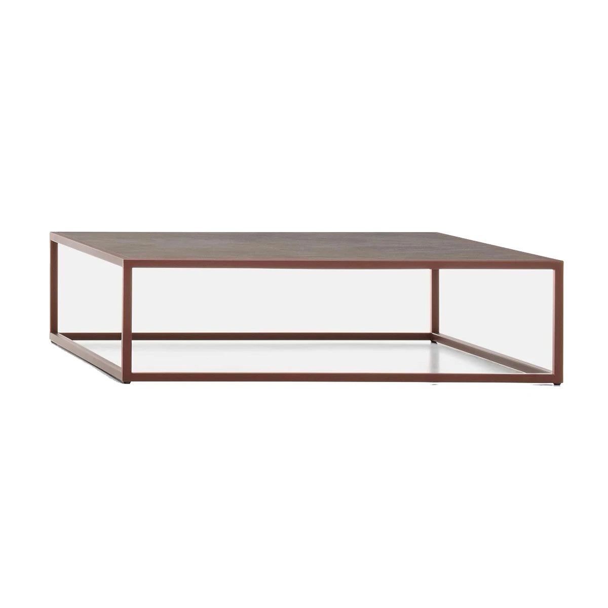 Loadbearing structure in stainless steel, 2 x 2 cm section, epoxy powder coated using specific treatment for outdoor use. Top made of fine porcelain stoneware laminate, matt variations in light grey calce or black calce. Bush hammered medium grey pietra di Savoia, and natural satin-finished corten.