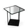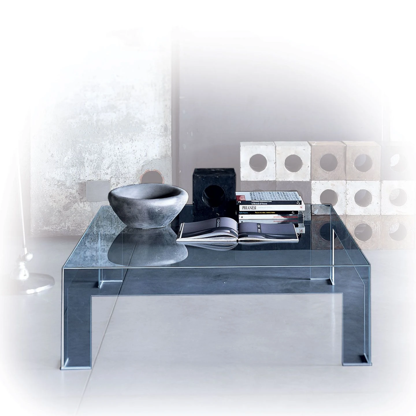 The formal purity and the sophisticated craftsmanship are the principle characteristics of this table, created with 6mm tempered glass plates cut with a water jet with a 45 degree chamfered edge. Available in extralight transparent glass or satin surfaced glass. Also available in 22cm height and rectangular sizes