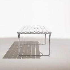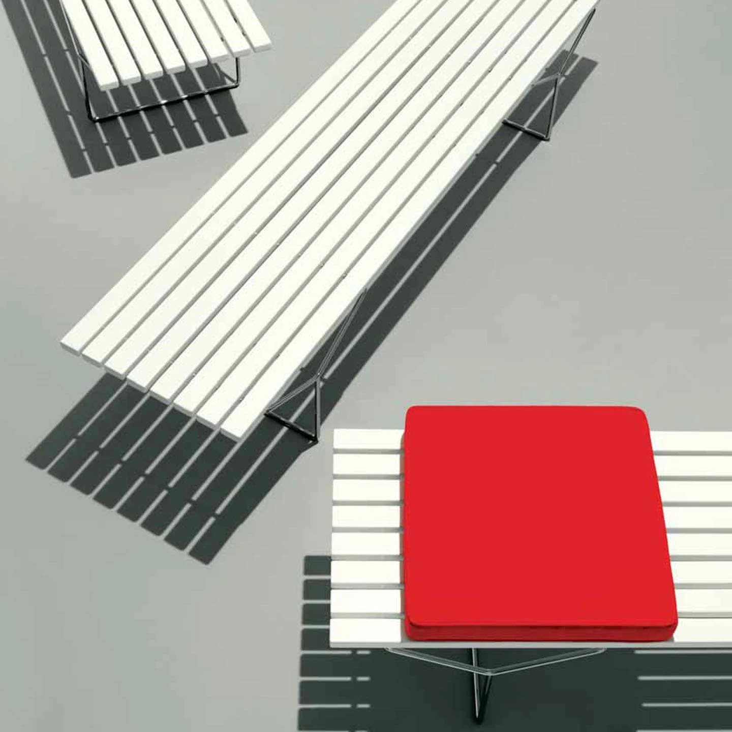 Designed in 1952, the slatted bench has been updated with modern materials. Acrylic stone is a mix of acrylic resin, aluminium hydroxide and natural pigments that ensures strength, water resistance and colour stability. Also available with teak slats; black or white Rilsan coated legs or stainless steel