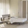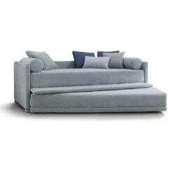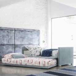 The Biss bed – designed by Pinuccio Borgonovo in 2011 – is a modular system with an ingenious base that hides a second guest bed. Version E comprises a low headboard, foorboard and backrest – other optoins are available. As shown, including frame, 1 mattress 90cm x 200cm, roll-out second bed, 1 mattress 85cm x 200cm, 2 bedspreads and 2 roll cushions. NOT including scatter cushions or bed linen sets. Many more fabrics and leathers available.