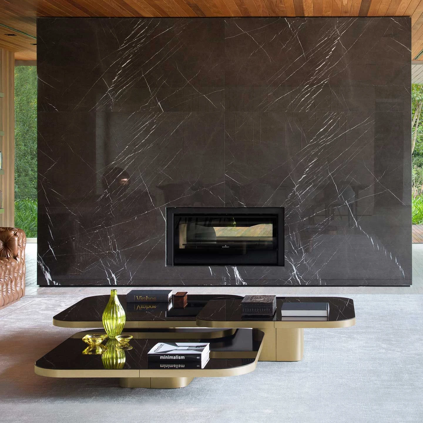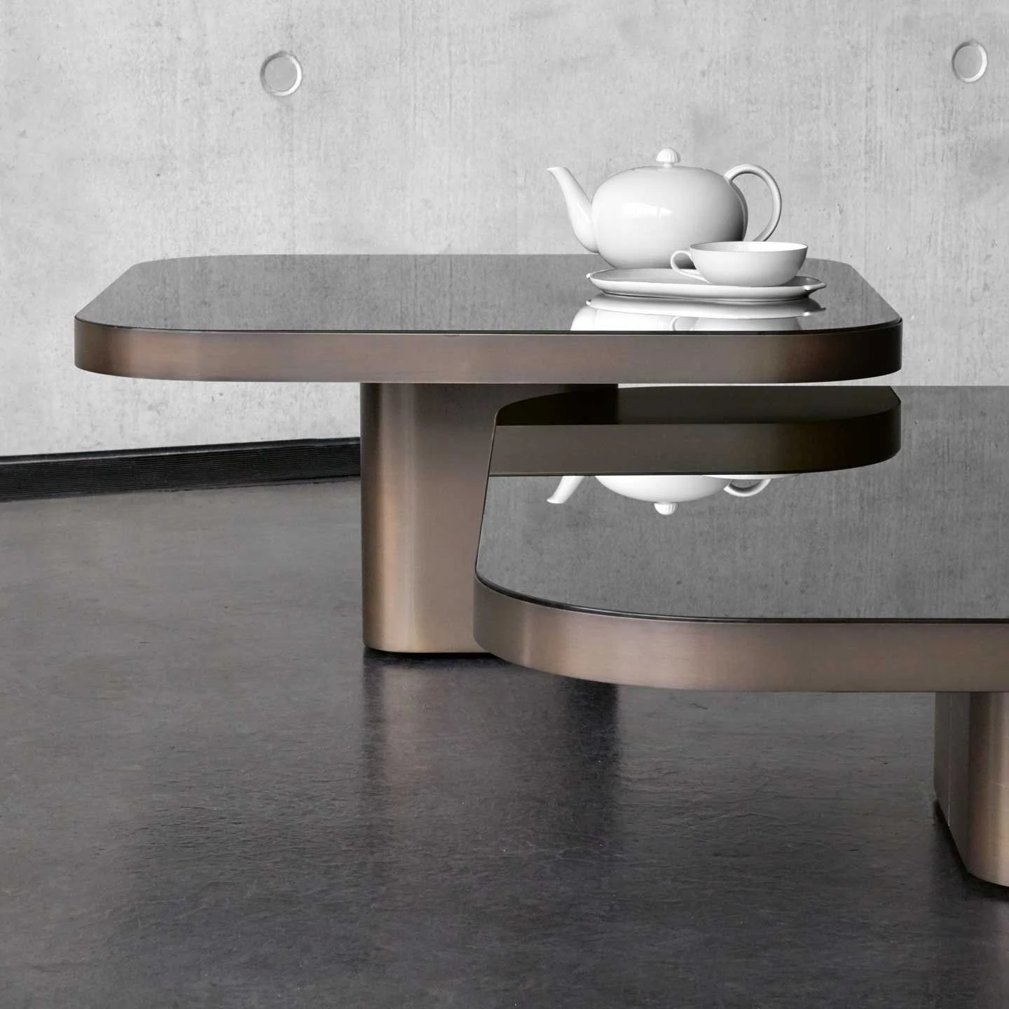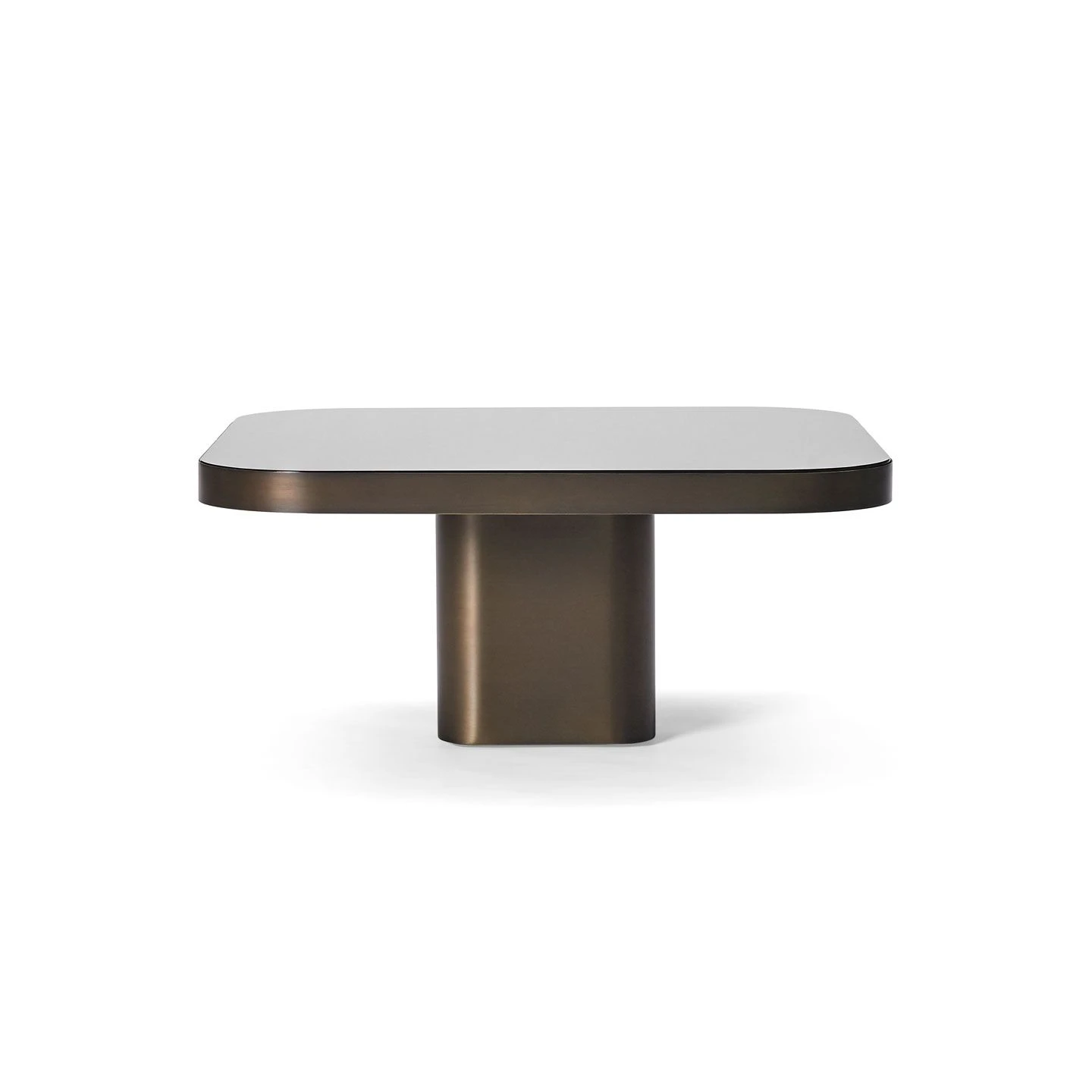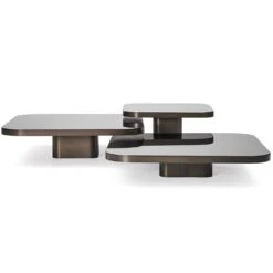 Bow Table No.3. Inspired by 1970s lines and designs, Brazilian Guilherme Torres presents a side table or coffee table of casual elegance. The glass or marble covered tabletop floats above a base with rounded edges. The three sizes are coordinated in a way that allows the tables to be arranged individually or as a group and with overlapping tabletops, like a dynamic sculpture. Natural or burnished solid brass sheet; tabletop made of black lacquered crystal glass, or in Nero Marquina marble. Contact the store for other sizes/heights.