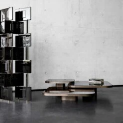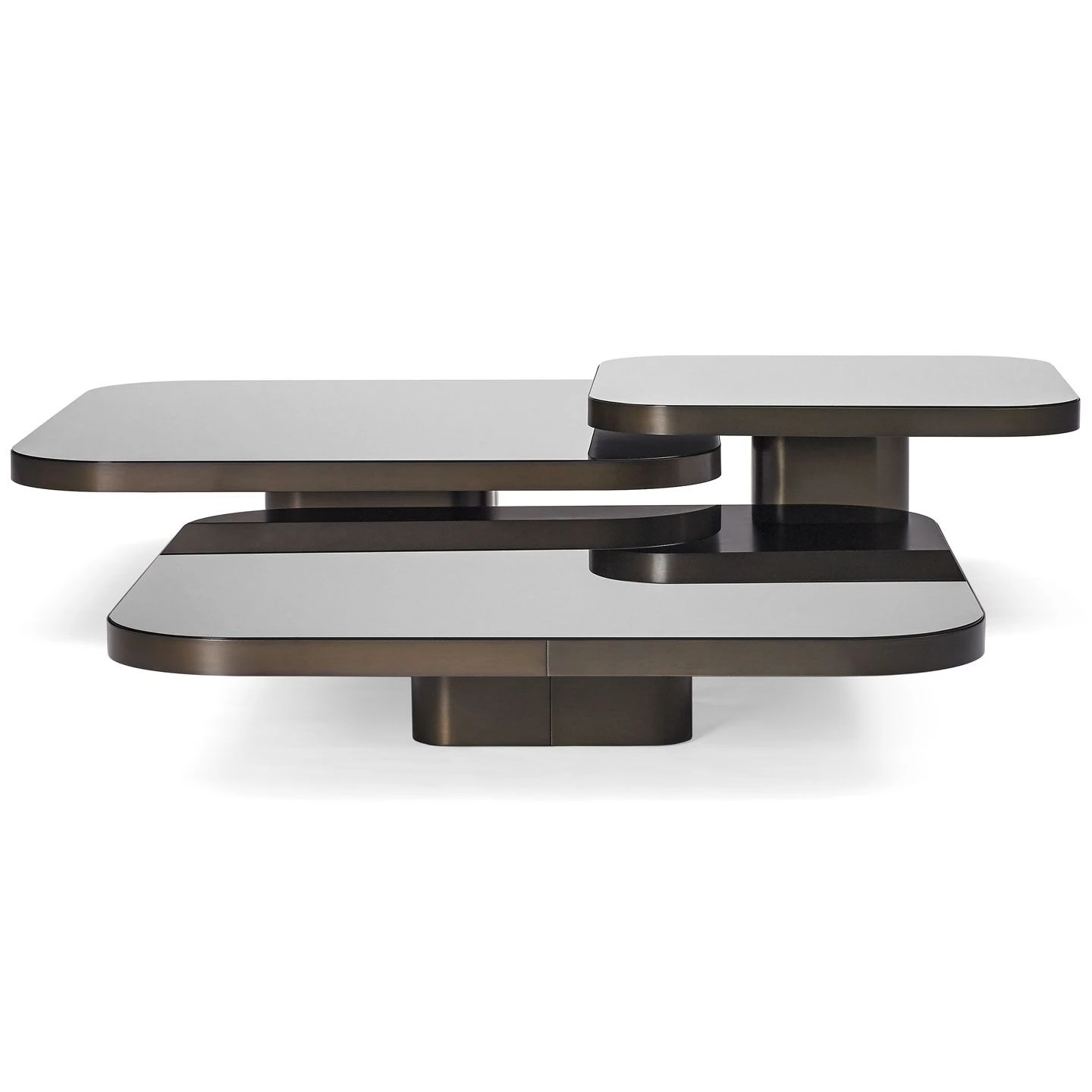 Inspired by 1970s lines and designs, Brazilian Guilherme Torres presents a side table or coffee table of casual elegance. The glass or marble covered tabletop floats above a base with rounded edges. The three sizes are coordinated in a way that allows the tables to be arranged individually or as a group and with overlapping tabletops, like a dynamic sculpture. Natural or burnished solid brass sheet; tabletop made of black lacquered crystal glass, or in Nero Marquina marble. Contact the store for other sizes/heights.
