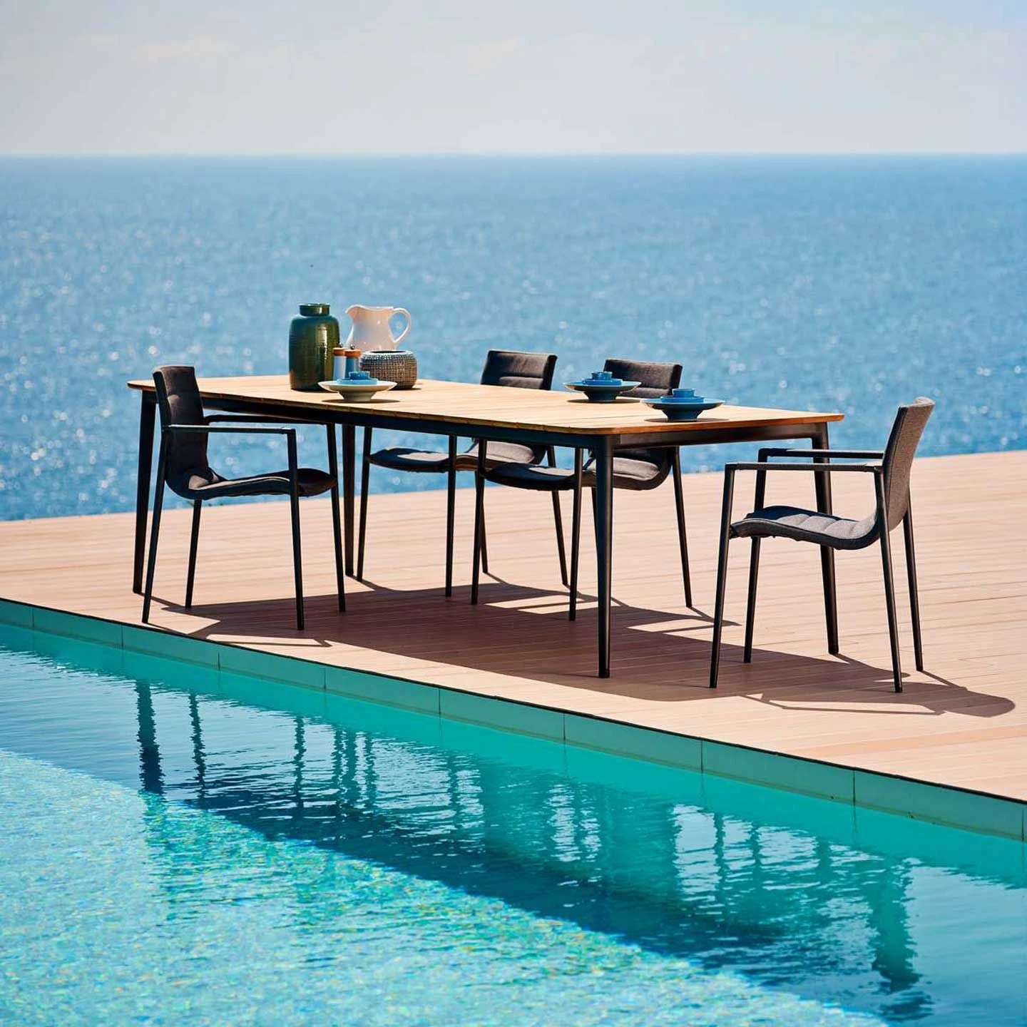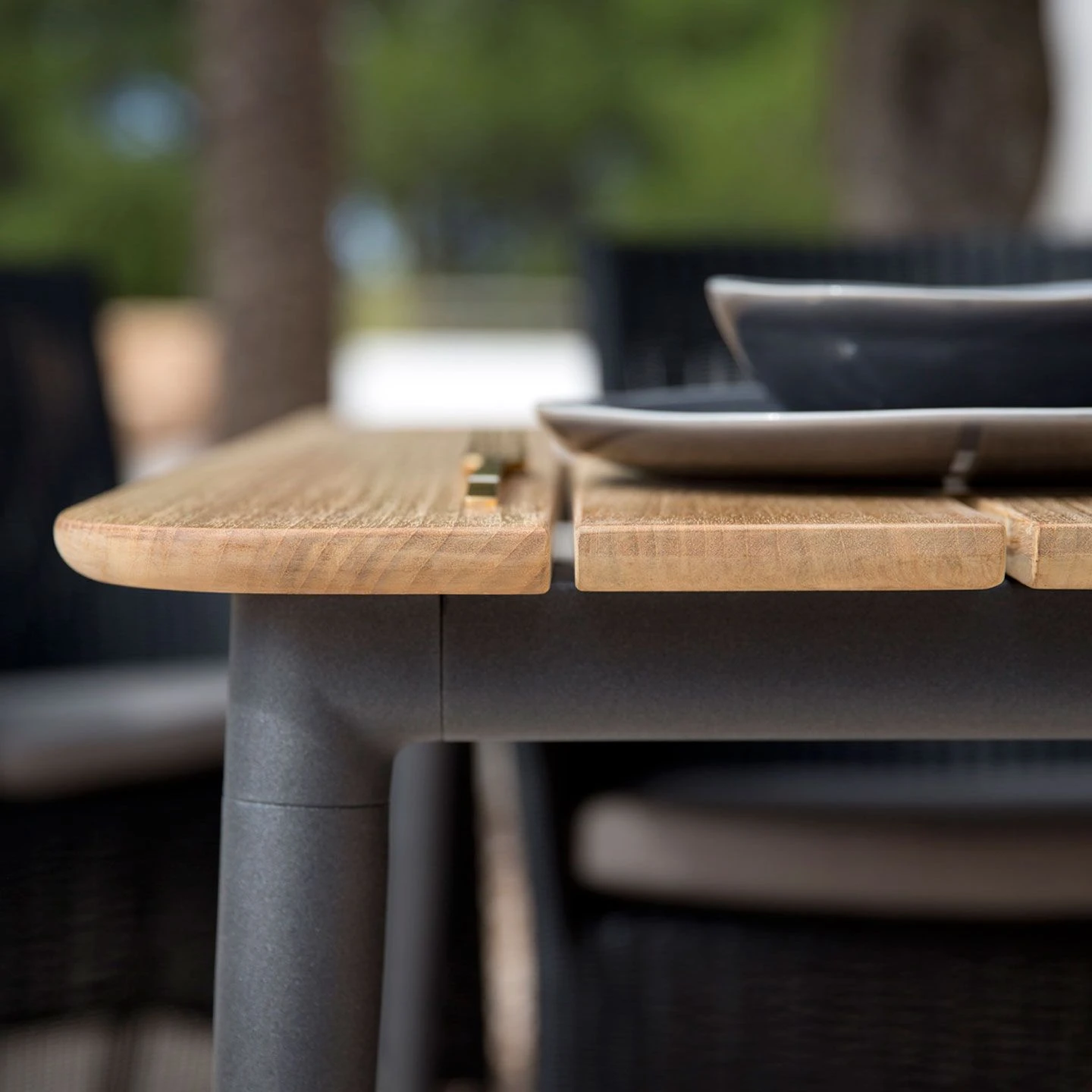 Cane-line’s new table Core combines the classic with the modern and lifts the use of teak in outdoor furniture to new levels. The soft curves of the table top are paired with a frame of conical pipes in powder coated aluminium. The result is a table that in spite of its light appearance is very strong and hardwearing. The teak slats are hand-selected and of highest quality, supplied by WWF/GFTN certified members in Indonesia.