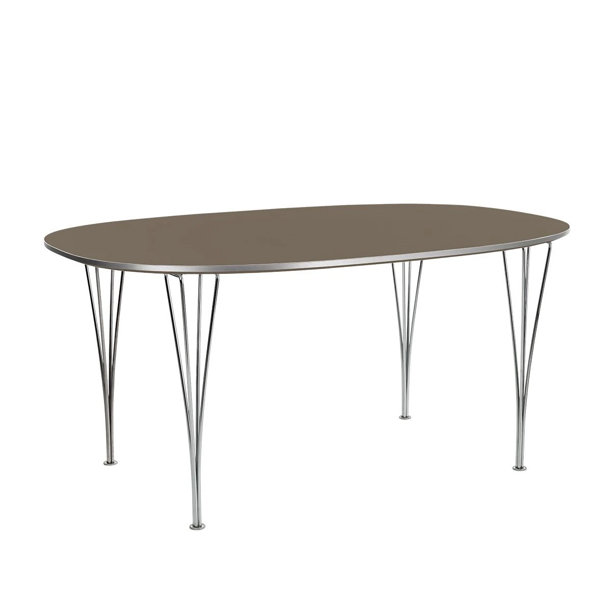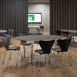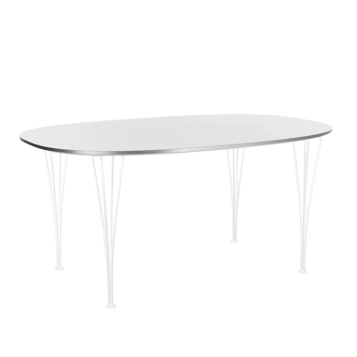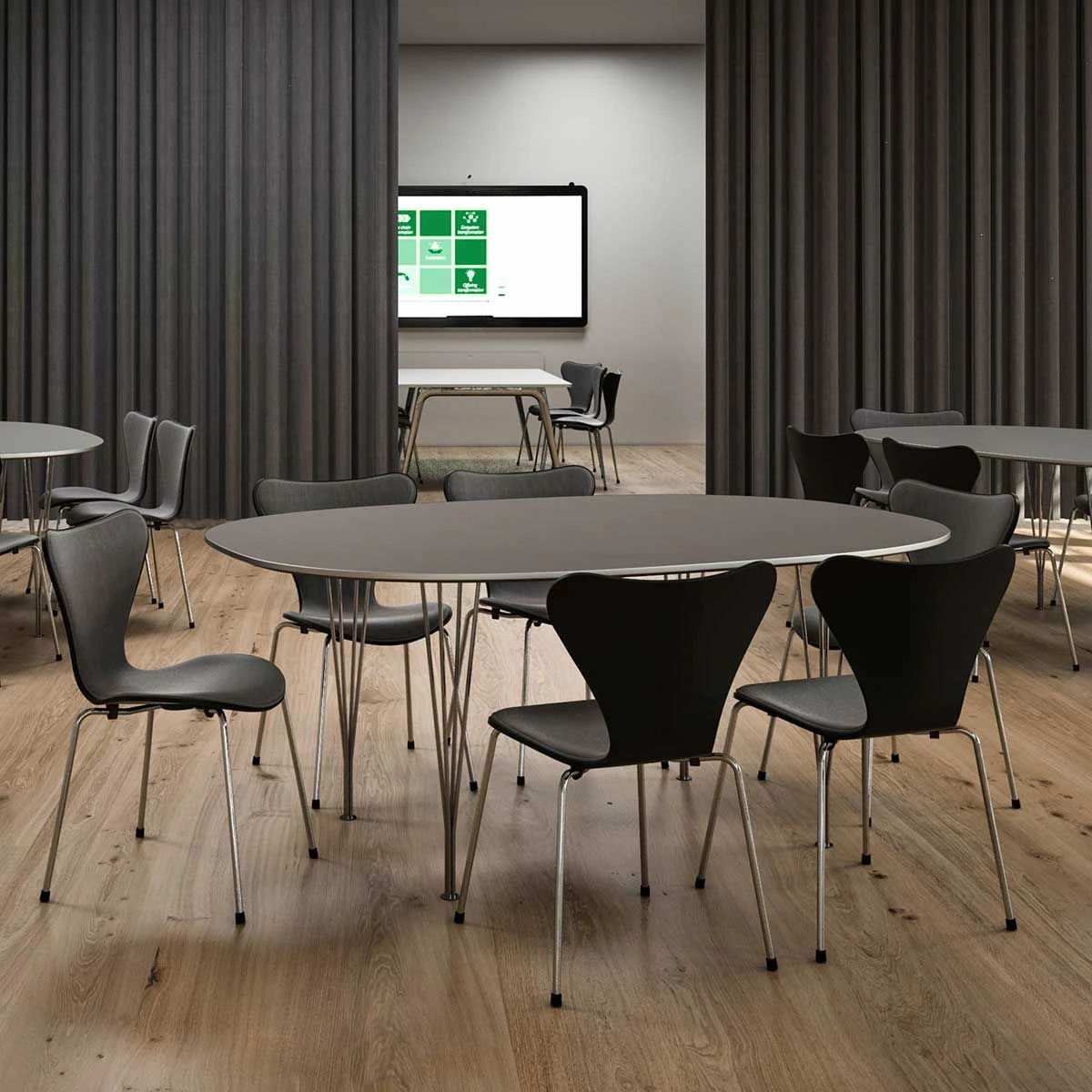Superellipse B616 Dining Table from Fritz Hansen’s Table series designed by Piet Hein, Bruno Mathsson, with Arne Jacobsen in 1968. The table features ‘span legs’ in a variety of finishes to match the laminate top options. The harmonious shape was inspired by the Sergels Torg roundabout in Stockholm designed by Piet Hein, a formula that promotes equal seating around the table. Wide range of sizes and finish options available.