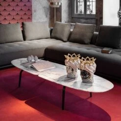 Graphium Occasional Table by Garcia Cumini for Zanotta. Originally designed in 2019 is this statement piece of an occasional table. The 20mm thick marble top is available in Red Lepanto, Sahara Black or Grey Calacatta all which have a stain-resistant protective varnish. The 2 marble elements are supported by a steel frame available in black or white. Here you can see the 681 Occasional table with black steel legs. This innovative design which showcases extreme stability and rigidness would naturally fit into any contemporary setting. Please contact the store for more options.