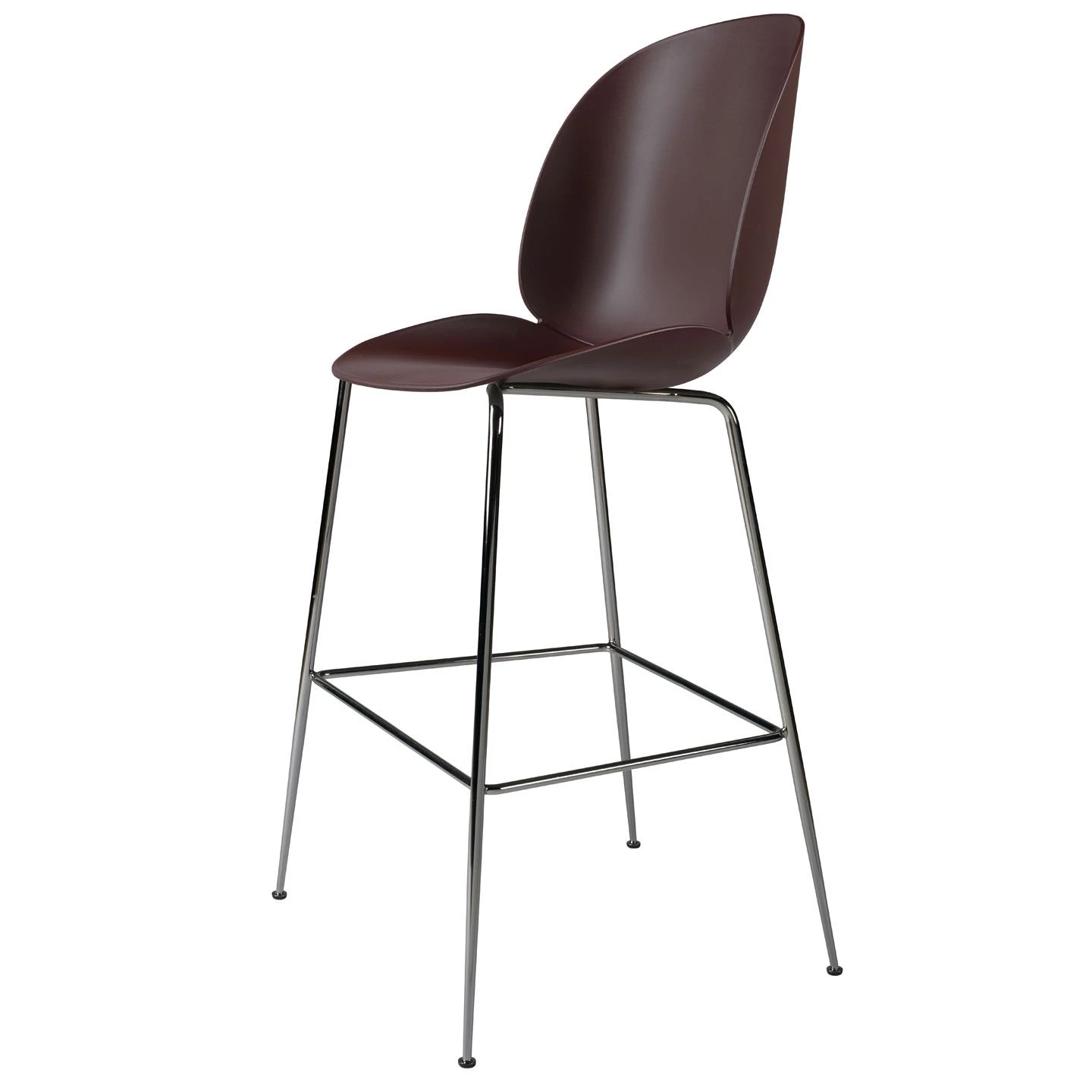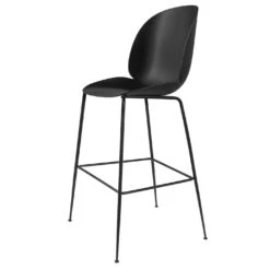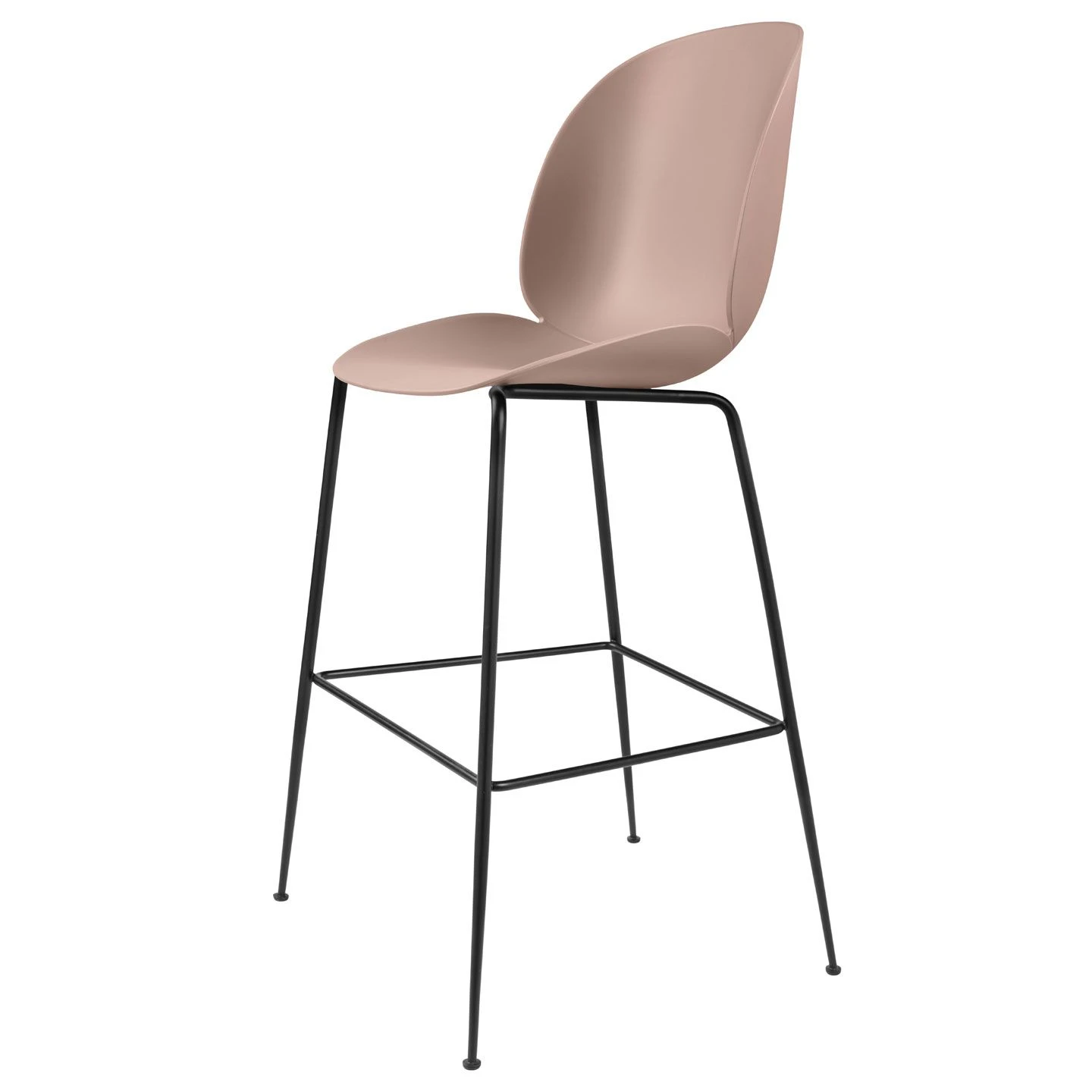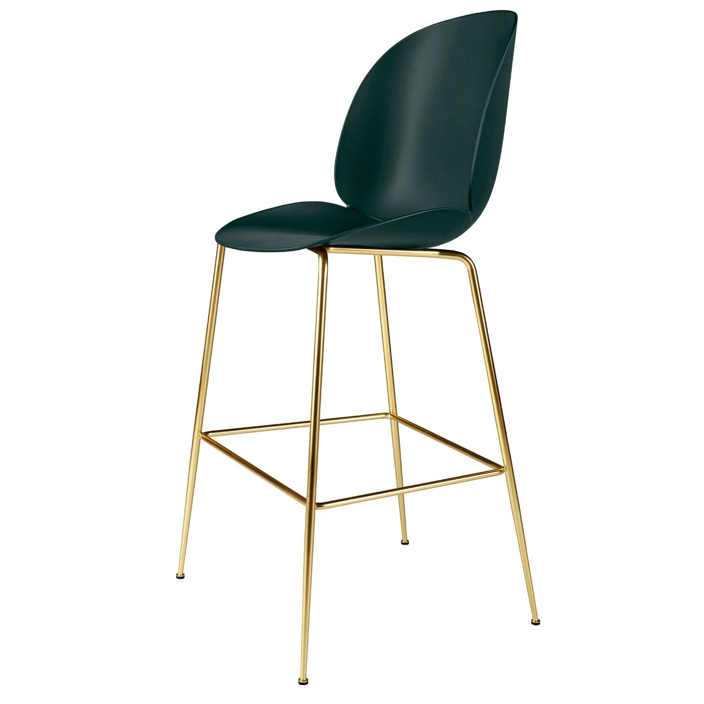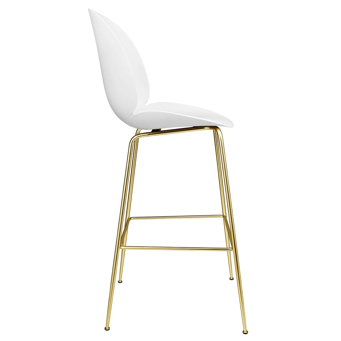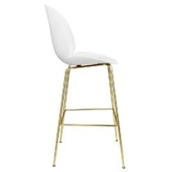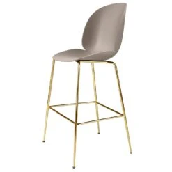 Bar height chair – seat height 74cm. When designers Gam Fratesi launched their Beetle chair in 2012, it proved an instant design classic. The latest option to be introduced is an un-upholstered plastic shell in seven subtle tones which maintains the iconic look of the chair whilst providing a more practical seating solution. Available on three types of metal legs: black painted (matt), black chrome or brass – with felt or plastic glides. Counter height chair also available at 64cm seat height.