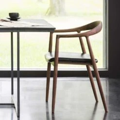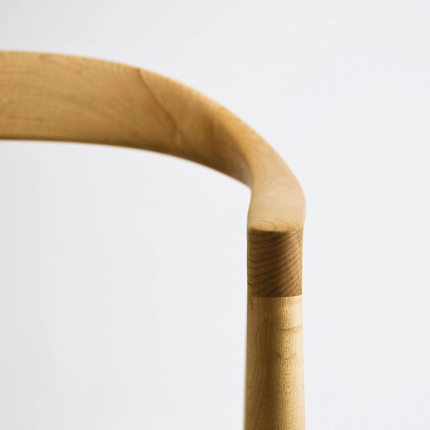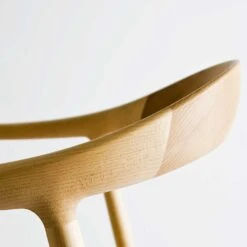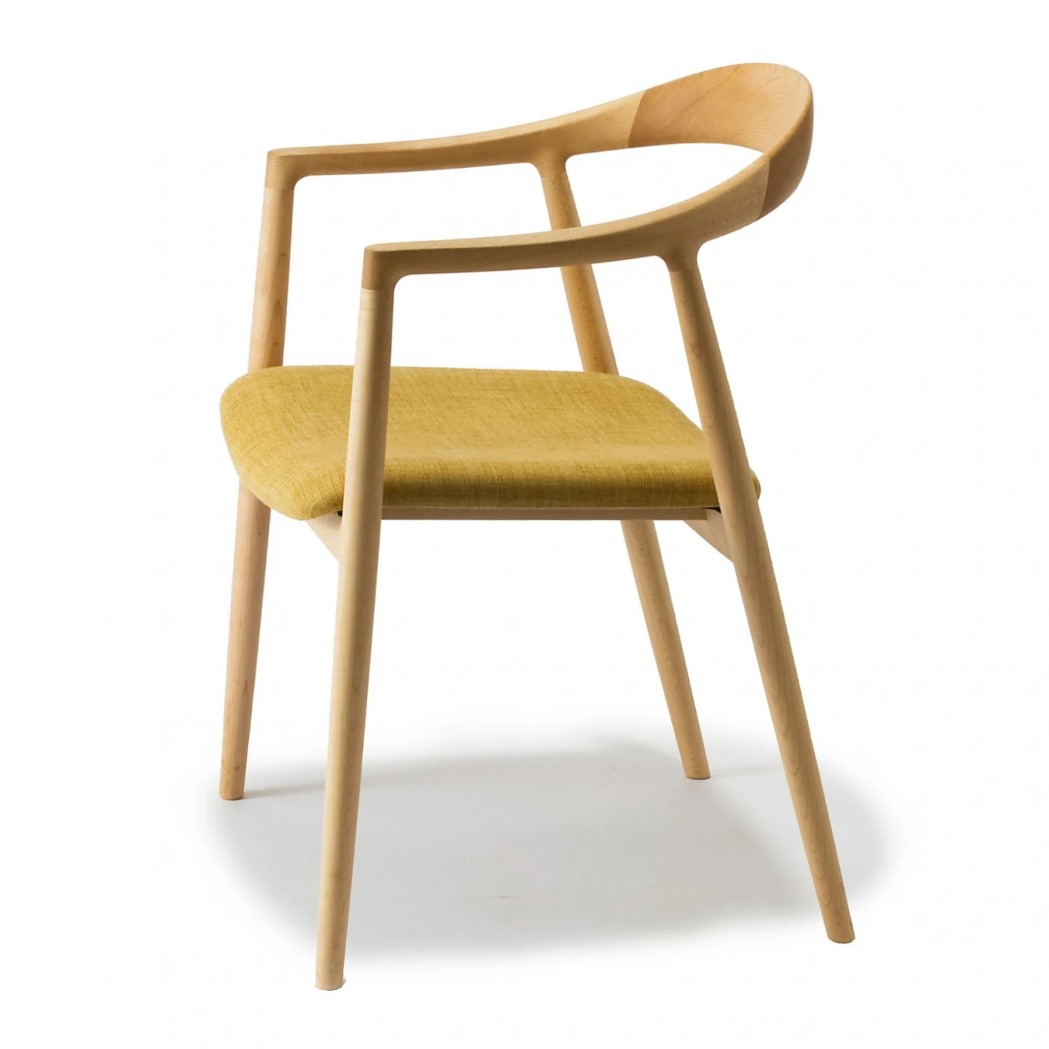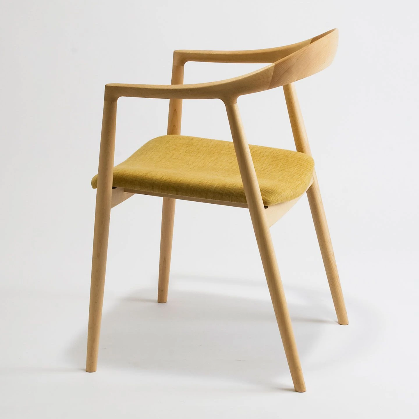 Designer Yoshinaga Keisha’s intention for this chair was “to create a slightly small and beautiful arm chair”. The name ‘hata’ refers to the Japanese words for both flag and kite. The line of the chair is evocative of a flag fluttering in a gentle wind. By shaving the natural wood elaborately, the chair looks graceful and feminine. There is a choice of woods for the frame, and a range of leathers and fabrics for the upholstery – contact the store for more info.