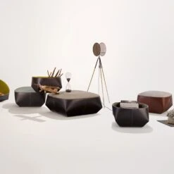 It is often the small things in life that give us so much pleasure. Because they make us aware of true quality, sensitise us to the elaborate nature of craftsmanship. Which is exactly what these objects do – upholstered seat, occasional table and basket. Fine saddle leather and elegant fabrics – the natural materials give these luxury pieces their special character. This ottoman is 72cm square – a larger ottoman, a glass topped coffee table and an open basket are also available.