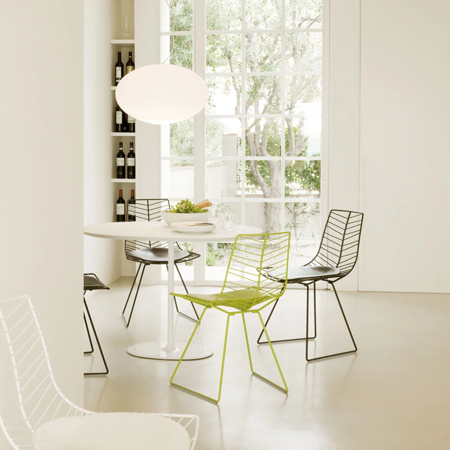 Fabricated from steel rod and finished in either chrome or EPC paint. The painted finishes only are suitable for outdoor use (not chrome). A cushion is available to order separately. NB – This chair must be ordered in FOURS.