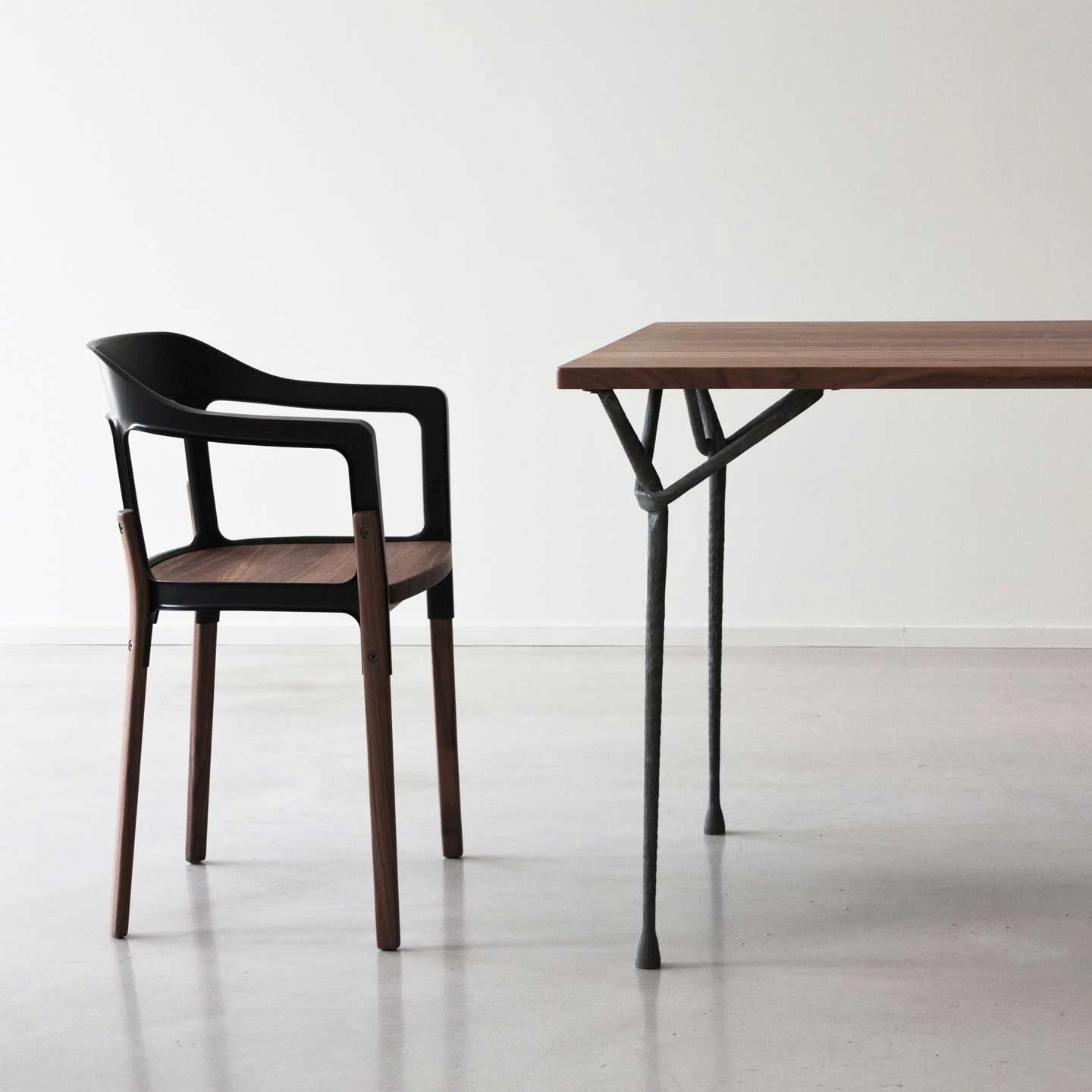An extensive new range of tables by the Bouroullec Brothers which pair hammered wrought iron legs and bases with tops of a variety of sizes and materials – black sheet steel, thermo treated ash, American walnut, Ardesian slate and Carrara marble. All finishes EXCEPT American walnut are suitable for outdoor use, although it is strongly advised to protect the tables from inclement weather.