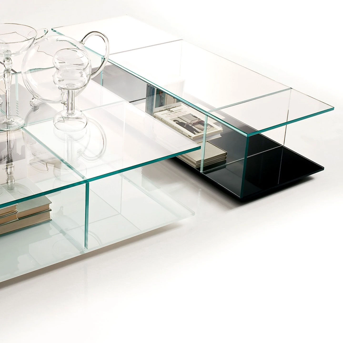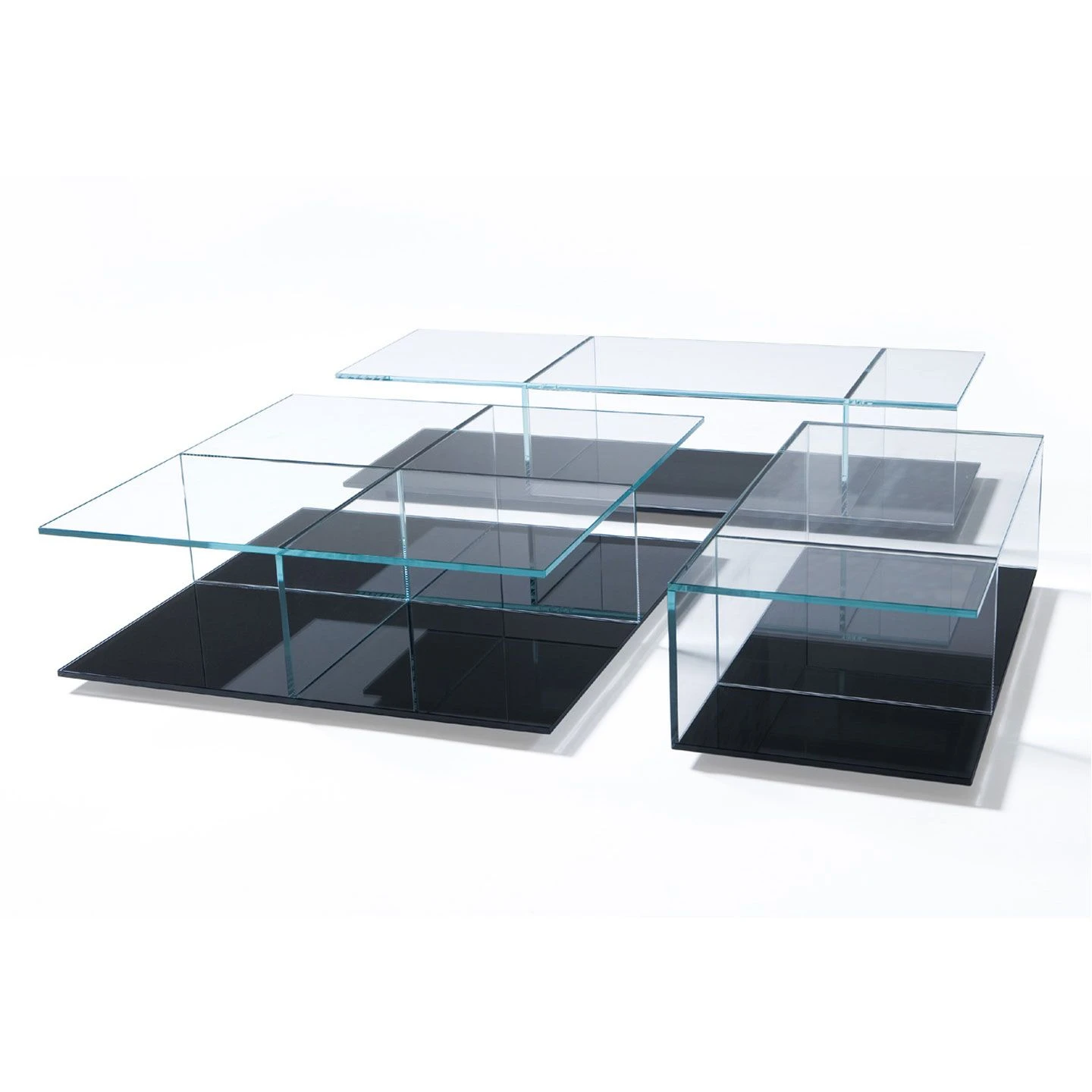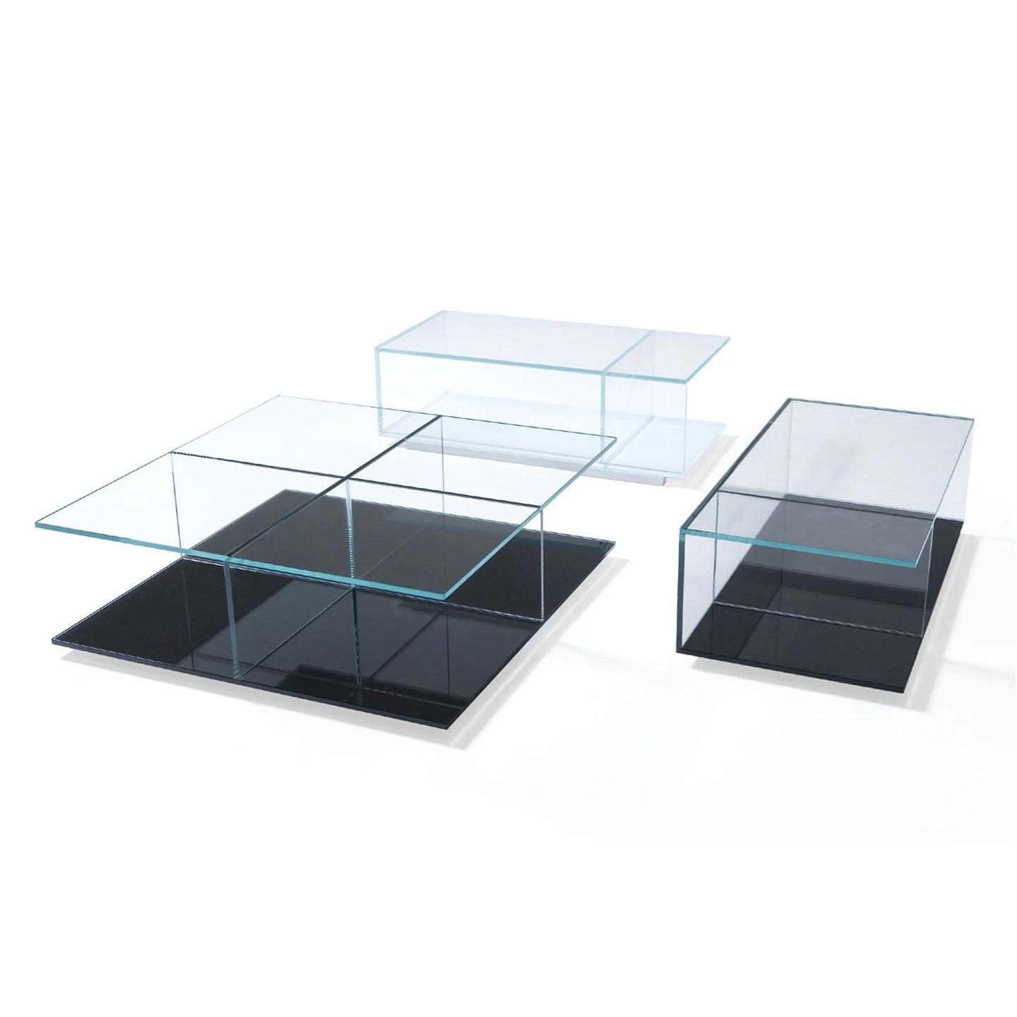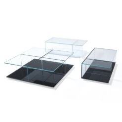 A series of small, low tables with tempered glass tops and bases finished in white or black.