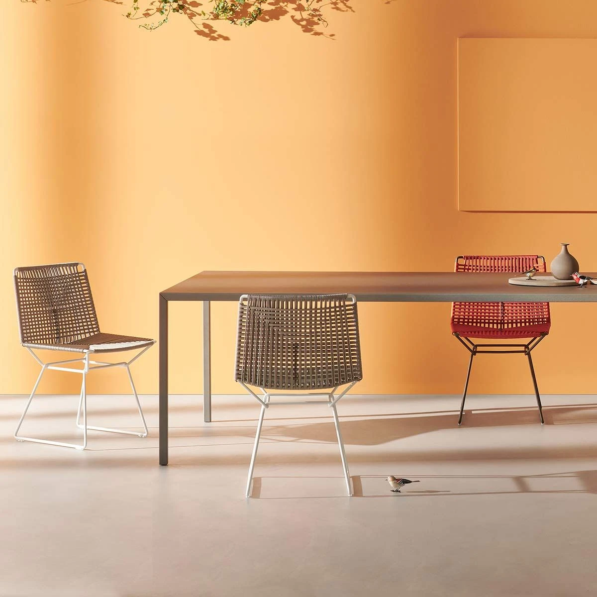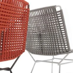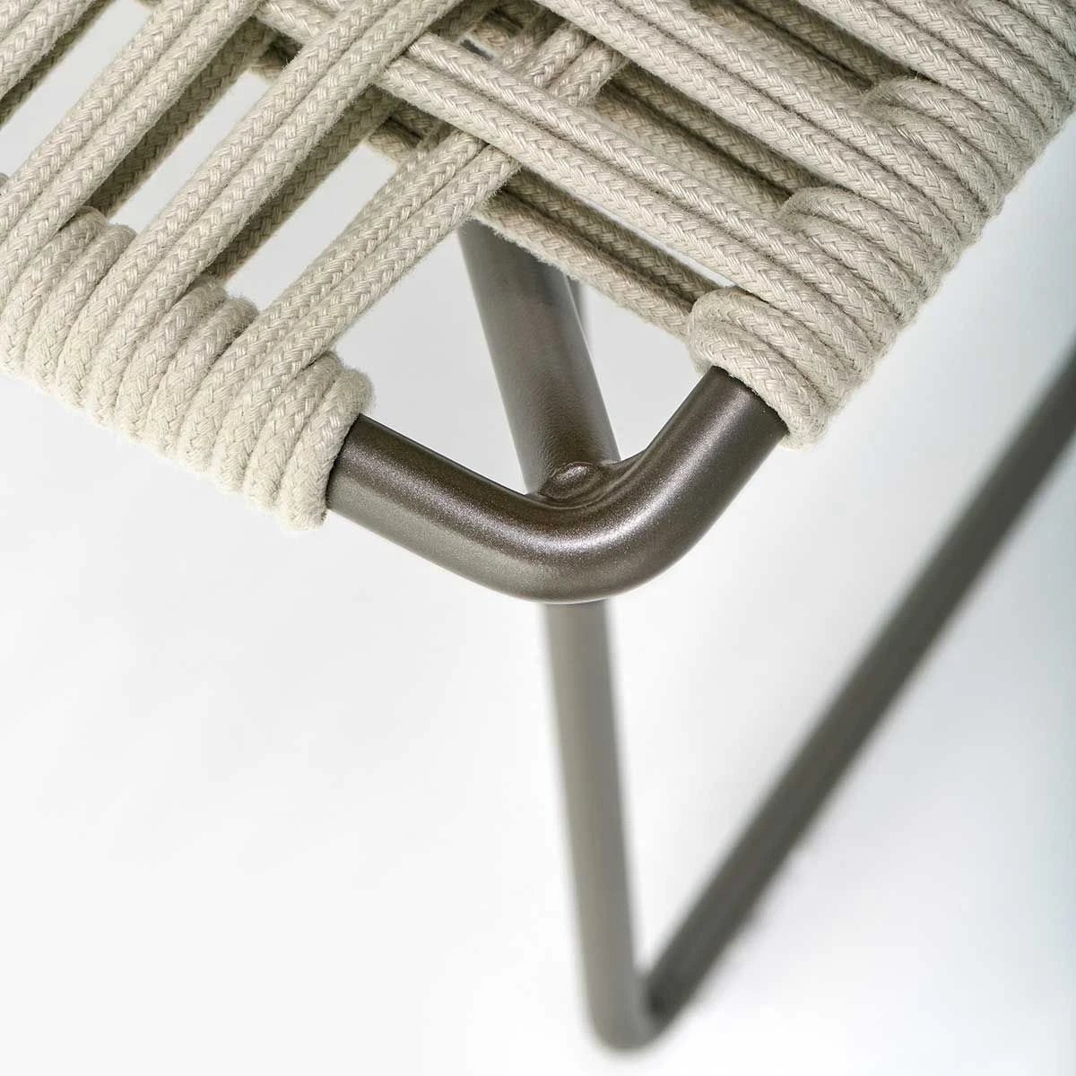 Load-bearing seating structure made of steel, woven with high-tenacity polyester cord, solution-dyed, guaranteeing high resistance to atmospheric agents, light, and abrasions, with stretch resistance. Sled-base made of steel rod. The frames are powder painted in matt white, bronze and black nickel with a specific treatment for outdoor use.
