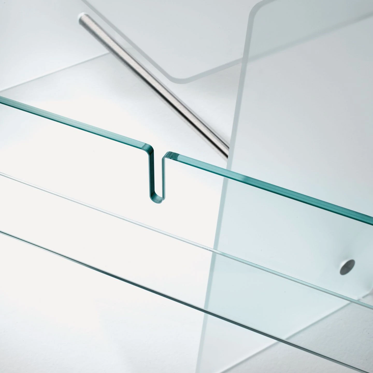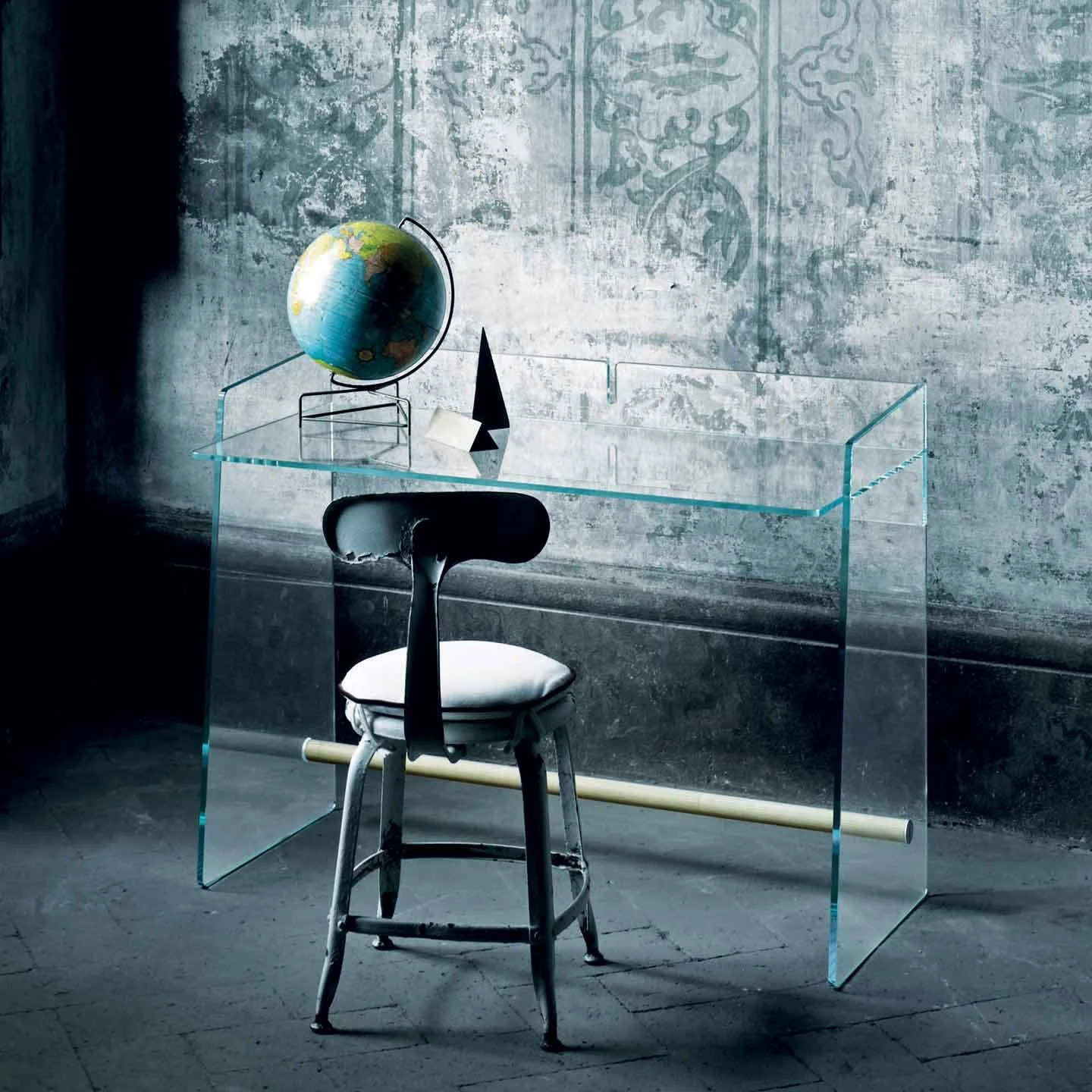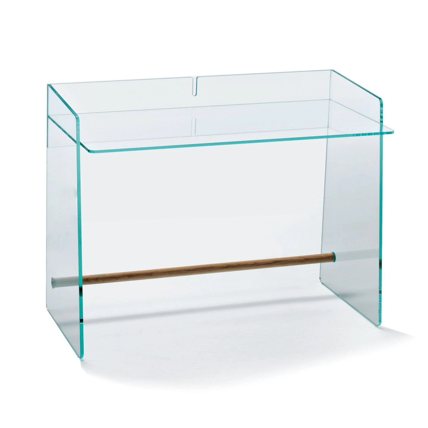 Desk or dressing table in tempered extralight transparent glass with thermo-welded joints. The great care of the details and the balanced proportions bestow an appearance of delicate harmony. The footrest bar is available in natural Ash wood or anodised aluminium. Also available in a smaller version 80cm wide