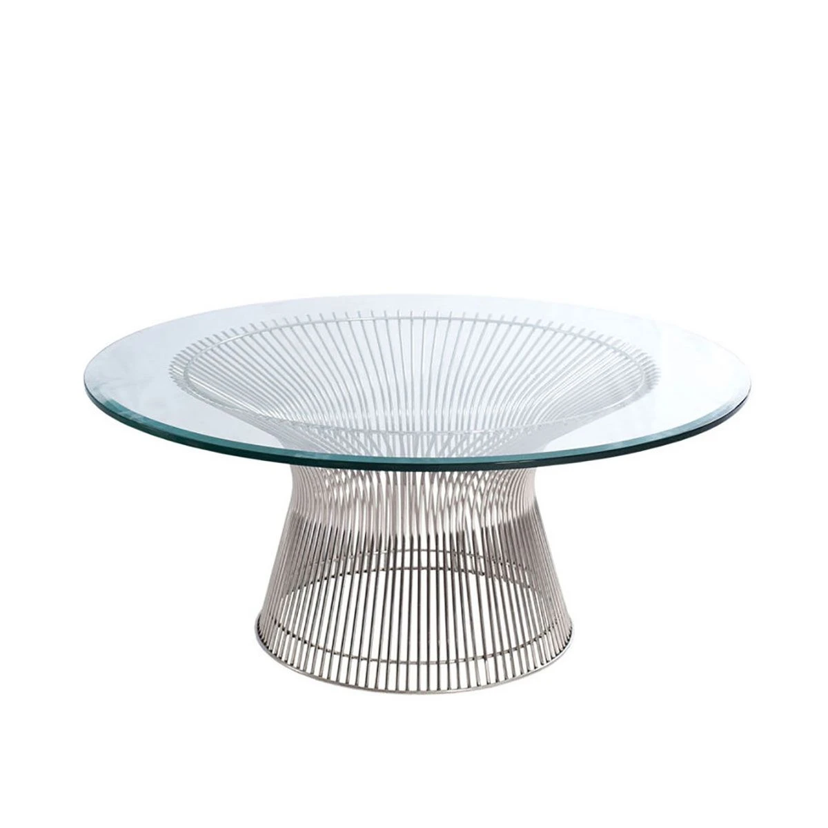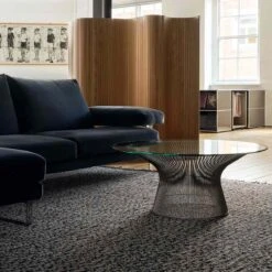In the 1960s, Warren Platner transformed steel wire into a sculptural furniture collection, creating a design icon of the modern era.Top options include clear glass, bronze glass and a variety of marble and veneer finishes. The base is available in two finish options: bright nickel finish with clear lacquer protection and painted metallic bronze.Also available in a larger 107cm version.