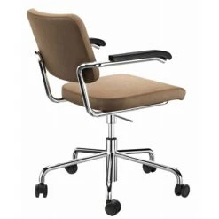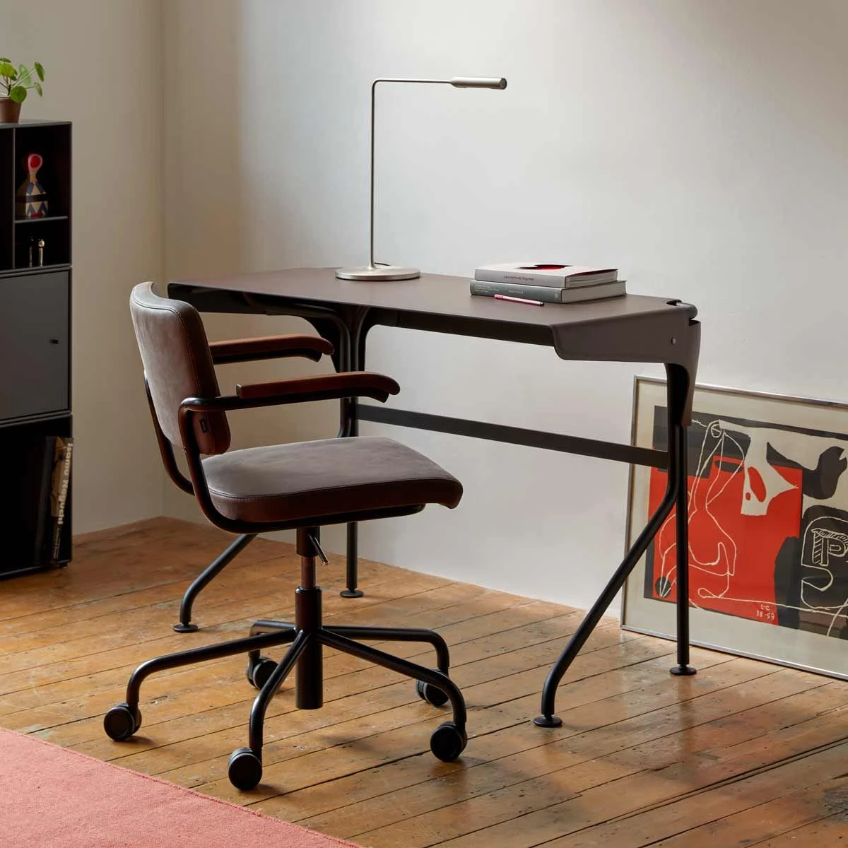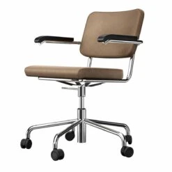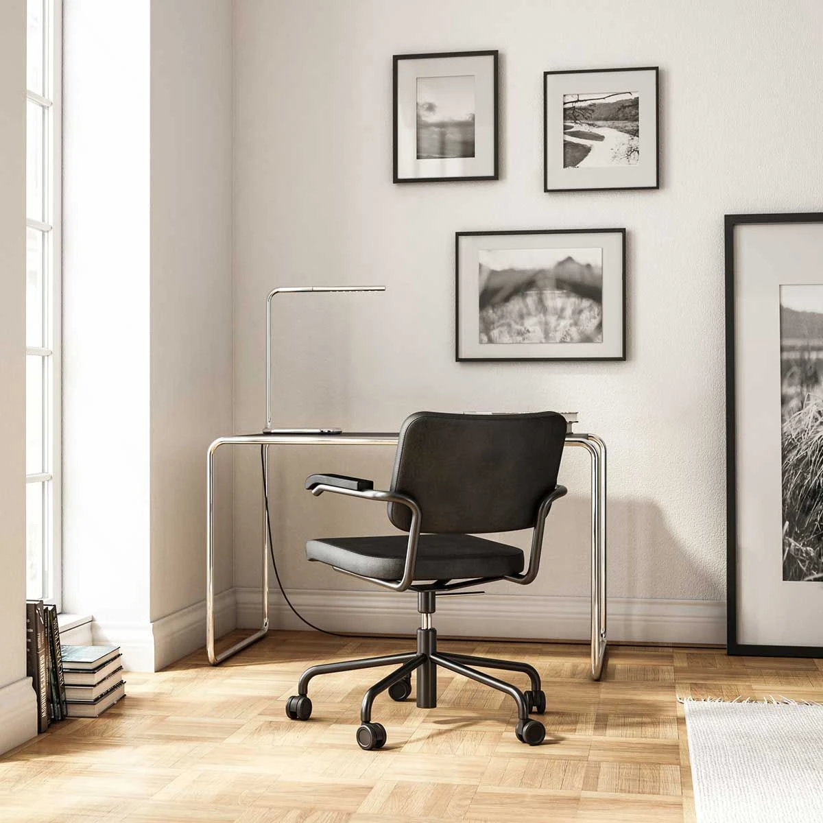 Steel frame, chrome plated or painted black RAL 9005 or white RAL 9010, with gas lift height adjustment and black castors