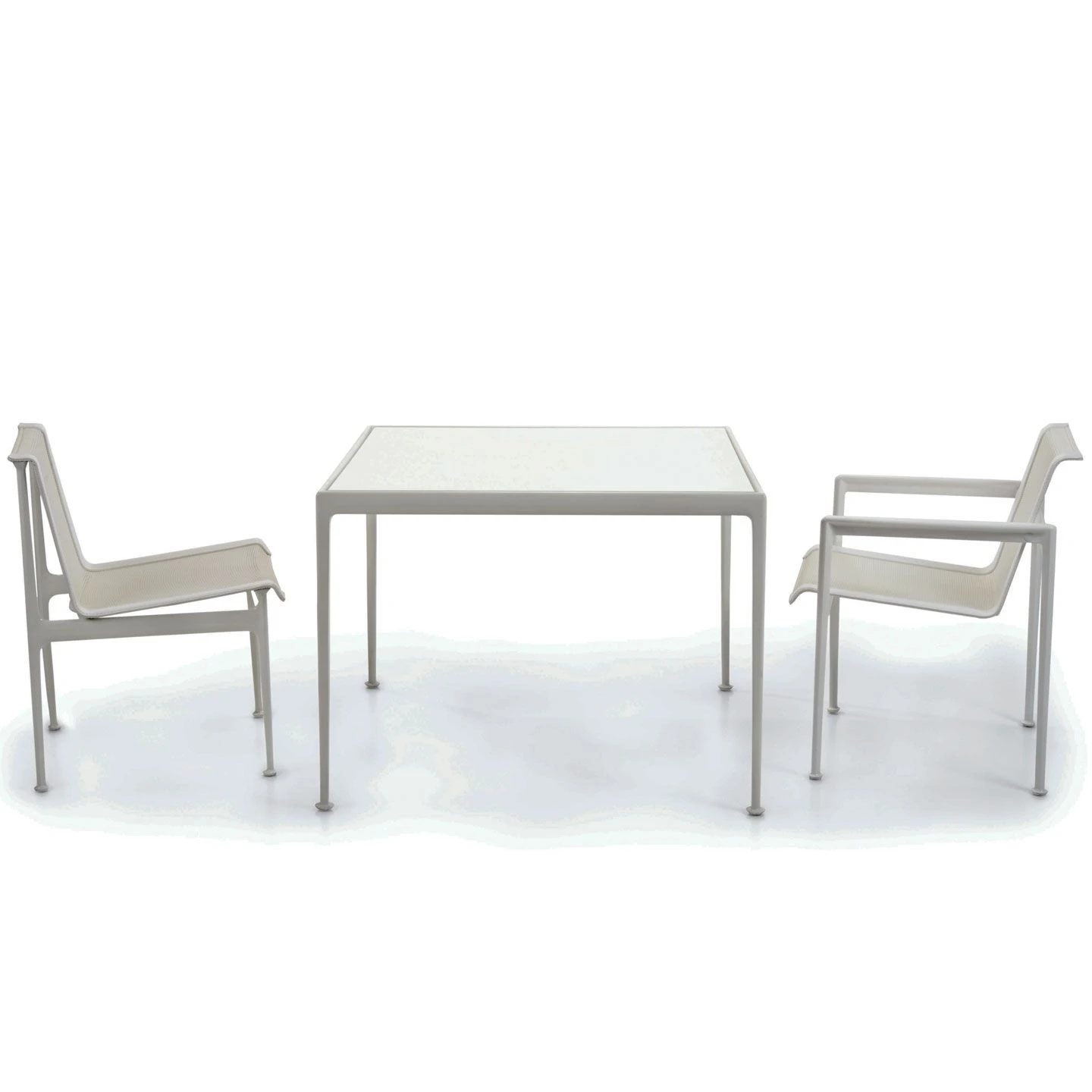 The 1966 Collection was developed at the request of Florence Knoll for her home in Miami – an outdoor range that would withstand the corrosive sea air. Dining table in cast and extruded aluminium with a weather resistant polyester powder coating and a porcelain enameled steel top. Chairs in cast and extruded aluminium frames with weather resistant polyester powder coat, woven vinyl coated polyester mesh and teflon thread.