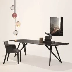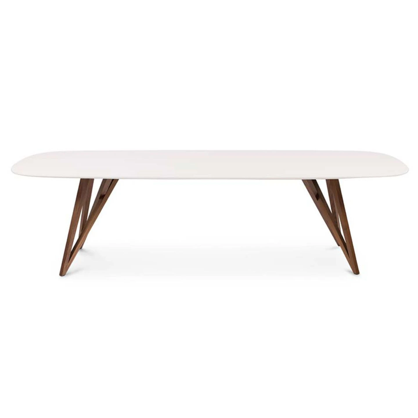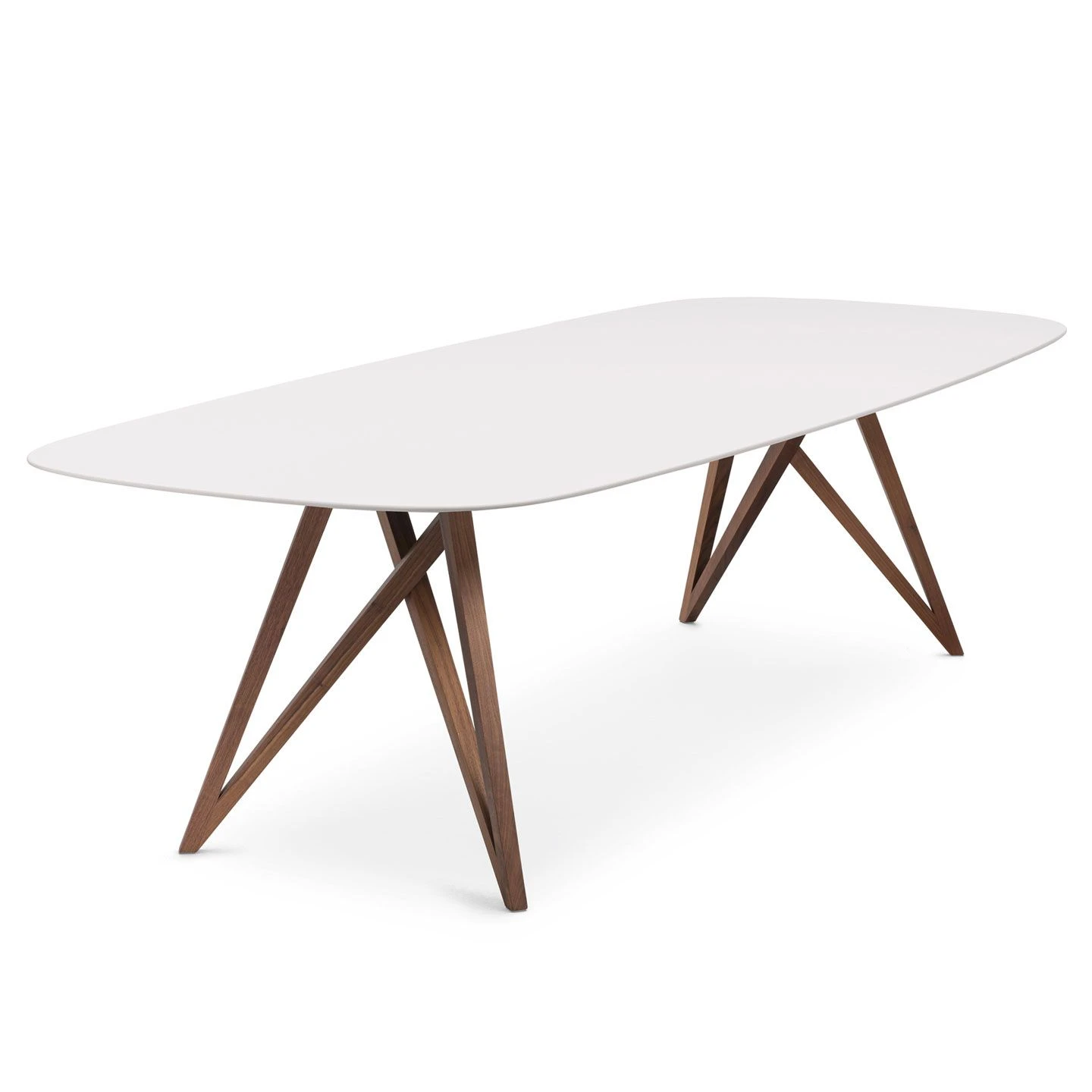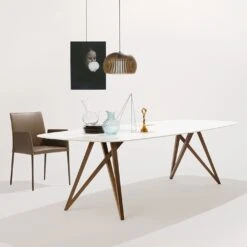 Table sculpture. There are tables that simply do not need showcasing. Their uniqueness makes them necessarily eye-catching. And that is the case with Seito. This dining table is a dream of lightness with its balanced lines, angles and surface. Effective understatement: the table top made of white or black quartz positioned on a base made of elegant nut wood. It is a joy to gather around such an impressive table in the very best of company. A smaller table of 210cm is also available.