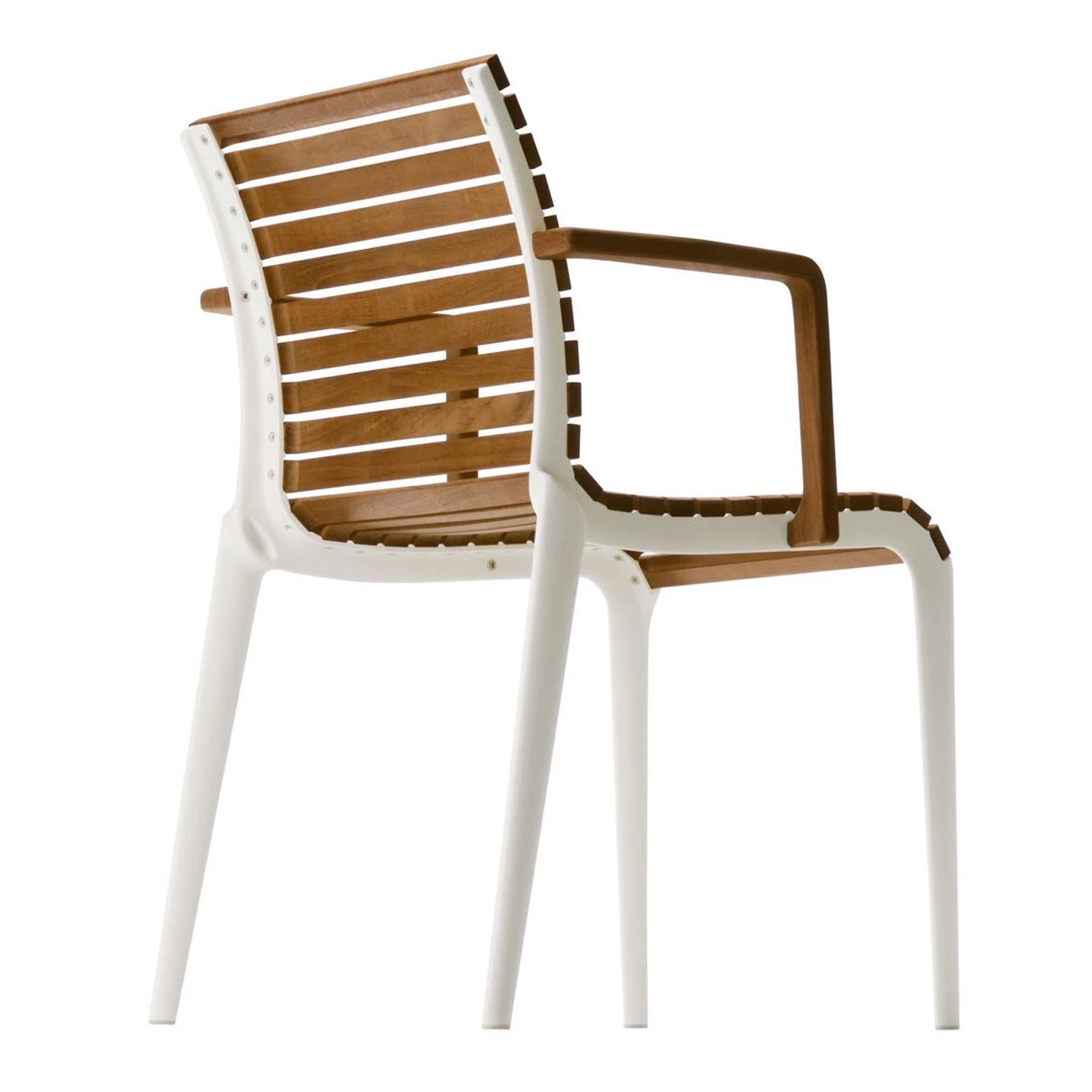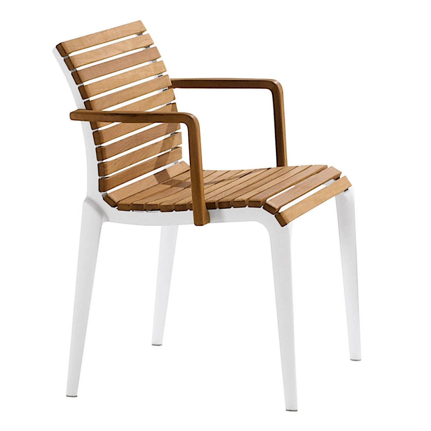 A stacking chair with arms suitable for outdoor use. The frame is made from stove enamelled die-cast aluminium with the seat and back made from natural teak slats – guaranteed by the manufacturer for two years. The perfect chair to go with the Teak folding table