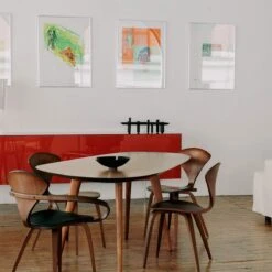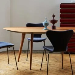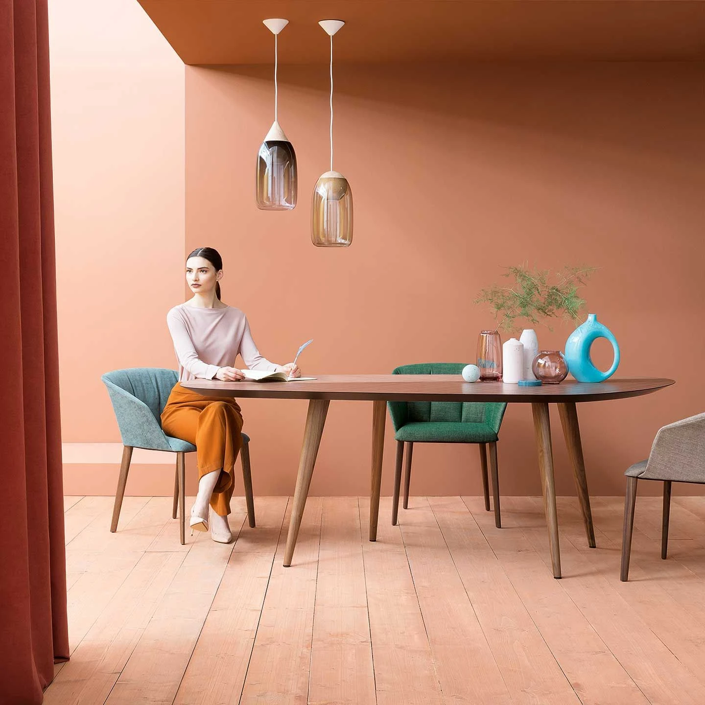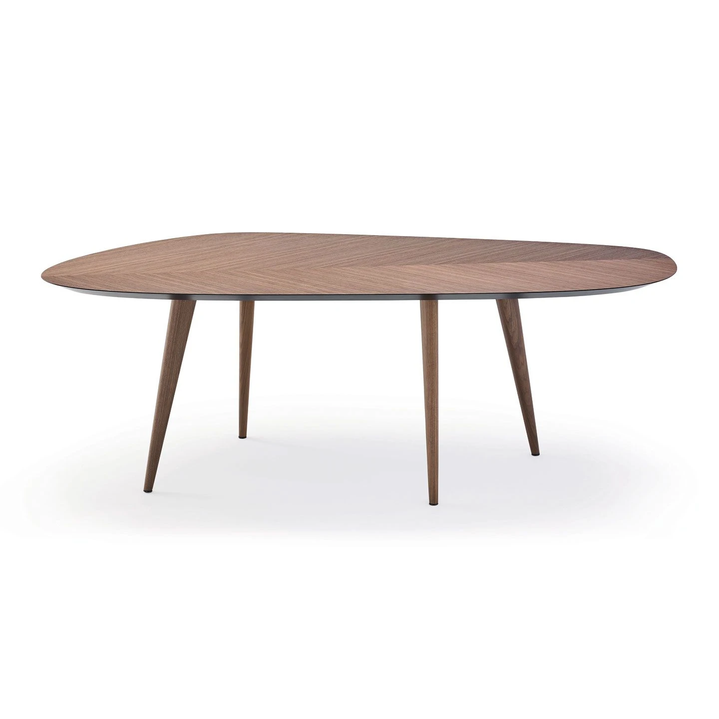 The distinctive shape and pattern of the Tweed dining tables, designed by Garcia Cumini for Zanotta in 2017, gives an ultra-modern twist to your dining room. Available in clear lacquered natural oak veneer with a grey painted underside or in clear lacquered Canaletto walnut veneer with a black painted underside. The solid wood legs match the top veneer. Three sizes available: 139cm x 123cm, 213cm x 100cm or 300cm x 100cm