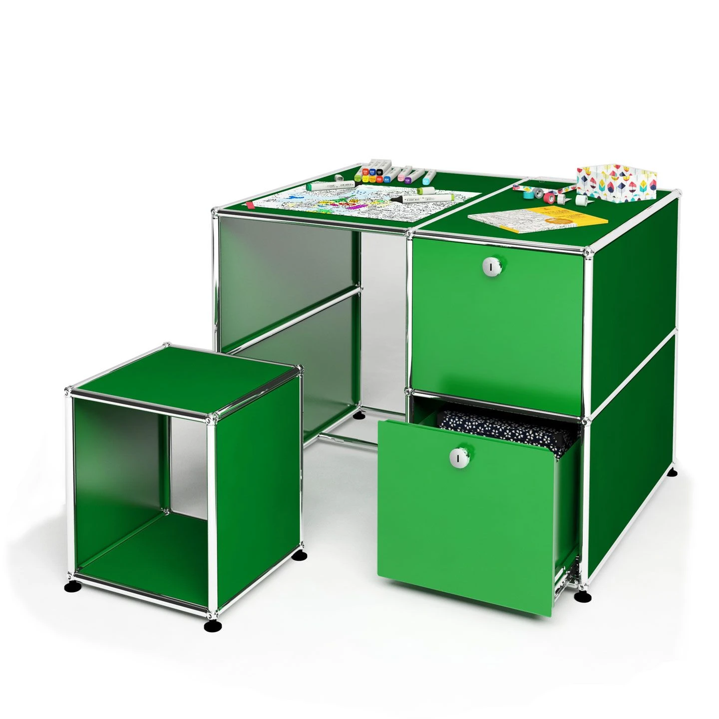 USM is a very versatile modular system of almost infinite possibilities. This is an example configuration which can be ordered ‘as is’ and makes a perfect solution for a kids room. Please contact the Store with your exact requirements for further options and different configurations. Ref: Kids04 – This small desk features two drawers and a storage cube which doubles up as a seat; it stands on feet. It is 740mm high. Accessories NOT included.