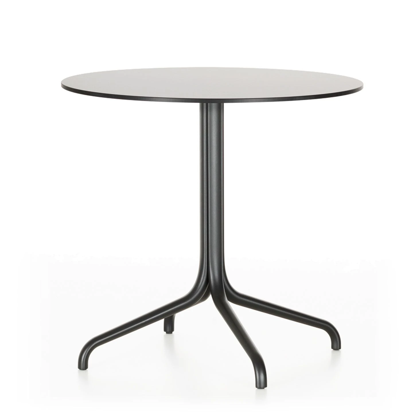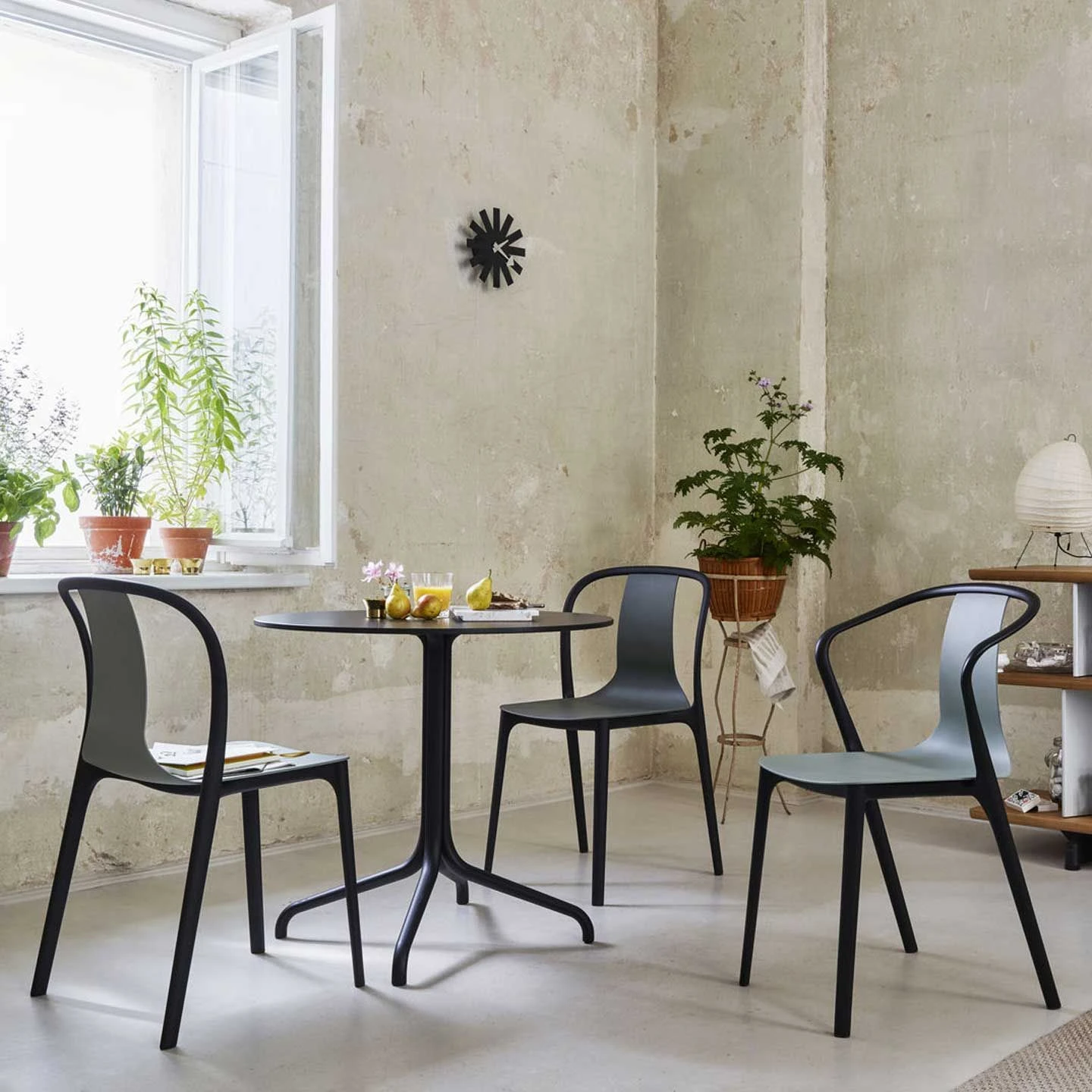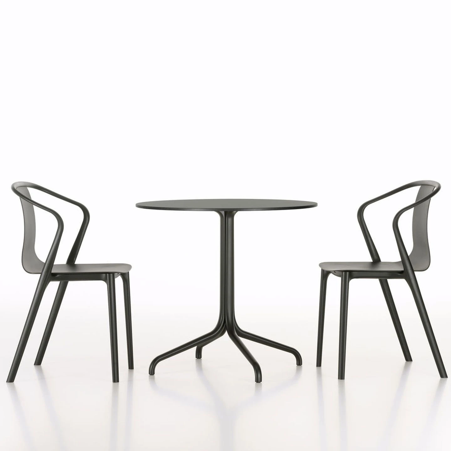 The Belleville Tables are modelled on the typology of the classic bistro table. The slender legs flow in a continuous sweeping line from the splayed bottom along the central column to the table top. In star-shaped or paired configurations, they form bases for small and large bistro tables or dining tables. Perfectly matched to the Belleville chairs and suitable for outdoor use.