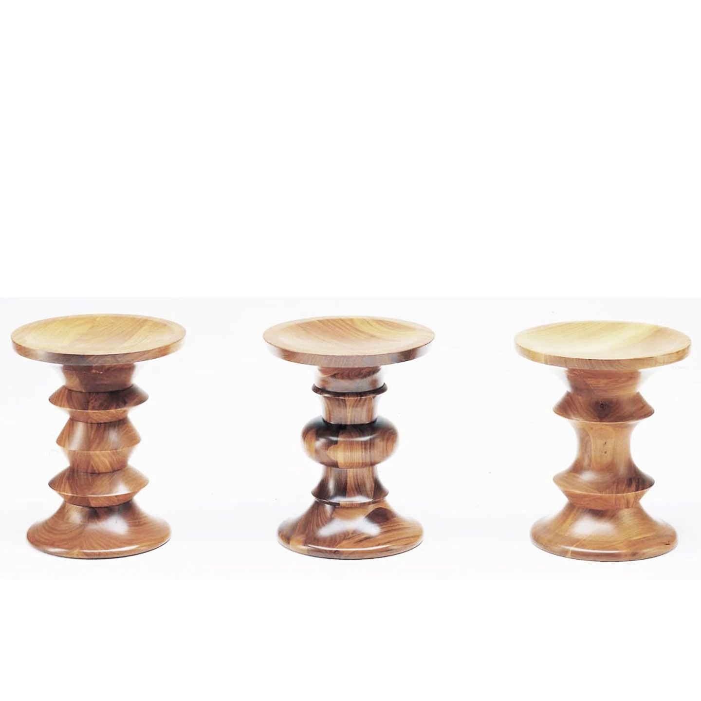 In 1960 the Eames office was commissioned by Time Inc. to fit out three lobbies in the Rockefeller Center in New York. As well as complete interior fixtures and fittings the project included the comfortable Lobby Chairs and a series of solid walnut stools. These turned stools which (as Ray Eames originally intended) can also be used as occasional tables, have three different design details in their centre sections. Available in 3 models: A, B or C.