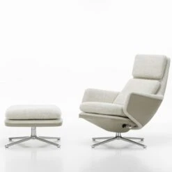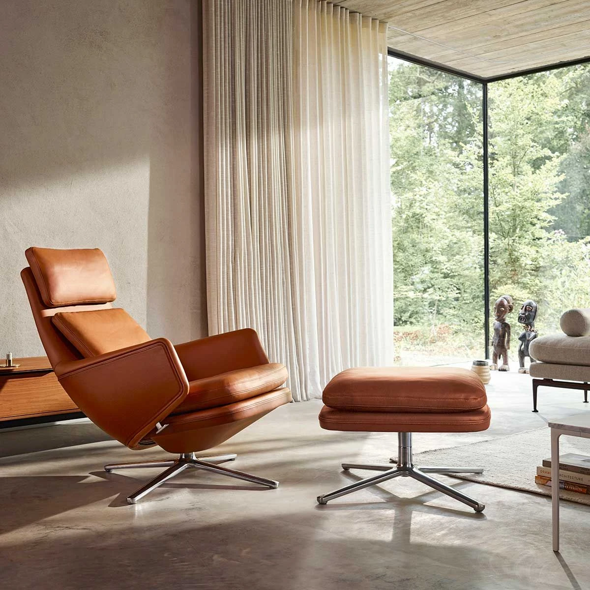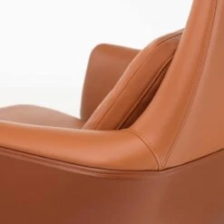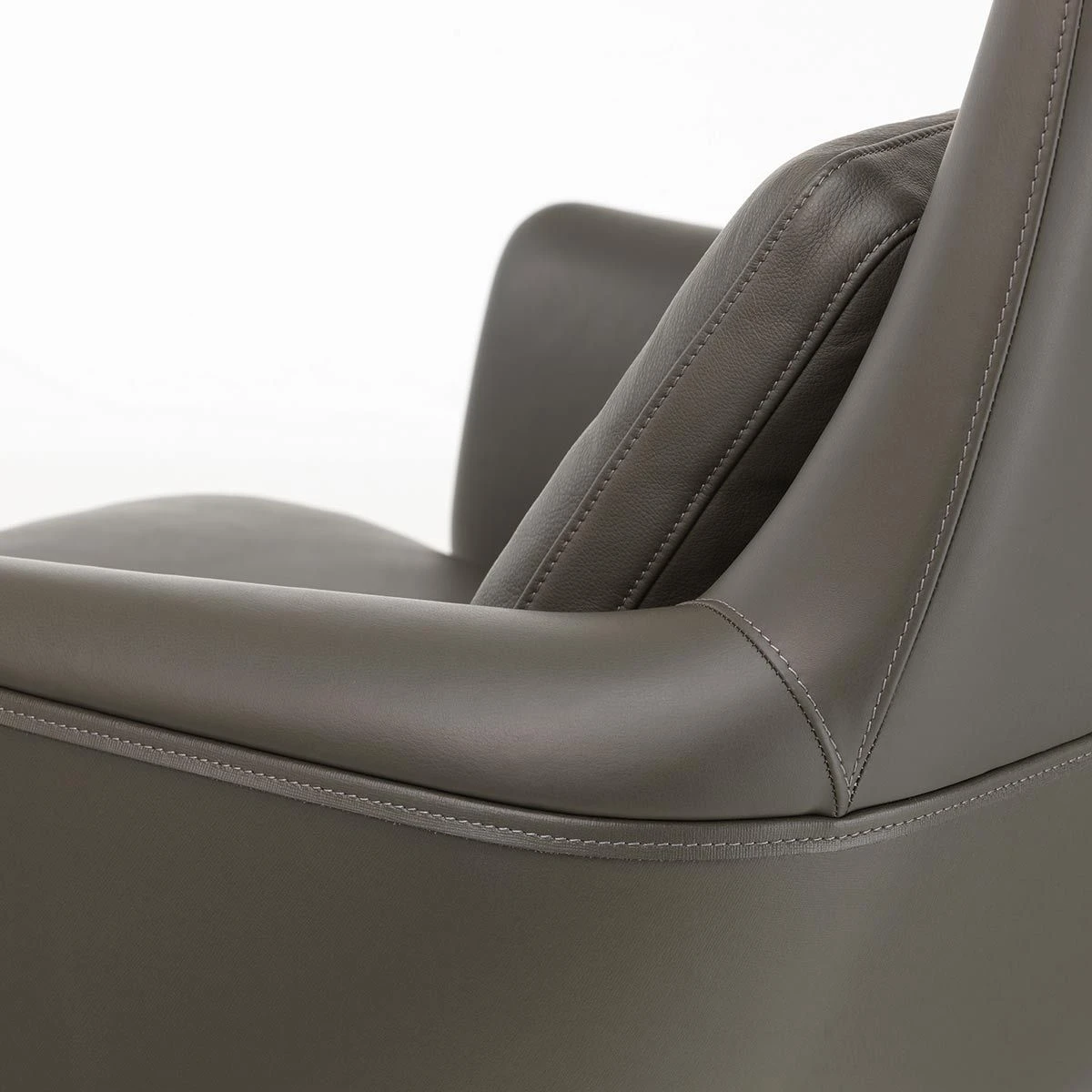 Grand Relax features a combination of choice materials, such as cast aluminium and high-quality leather. Antonio Citterio developed the armchair around the concept of using leather as a cover material, and wanted the cushions to have a crumpled and used look. He therefore selected particularly soft leather cushions that acquire an appealing patina with visible creases through use, giving each armchair a unique appearance.The lower half of the outer backrest shell is covered with embossed split leather, forming a type of shield that enfolds the user, while defining the contours of the lounge chair. The combination of split leather and Leather Premium F creates a dynamic contrast between the armchair’s inner and outer faces. Split leather is also used to cover the understructure of the seat and ottoman.